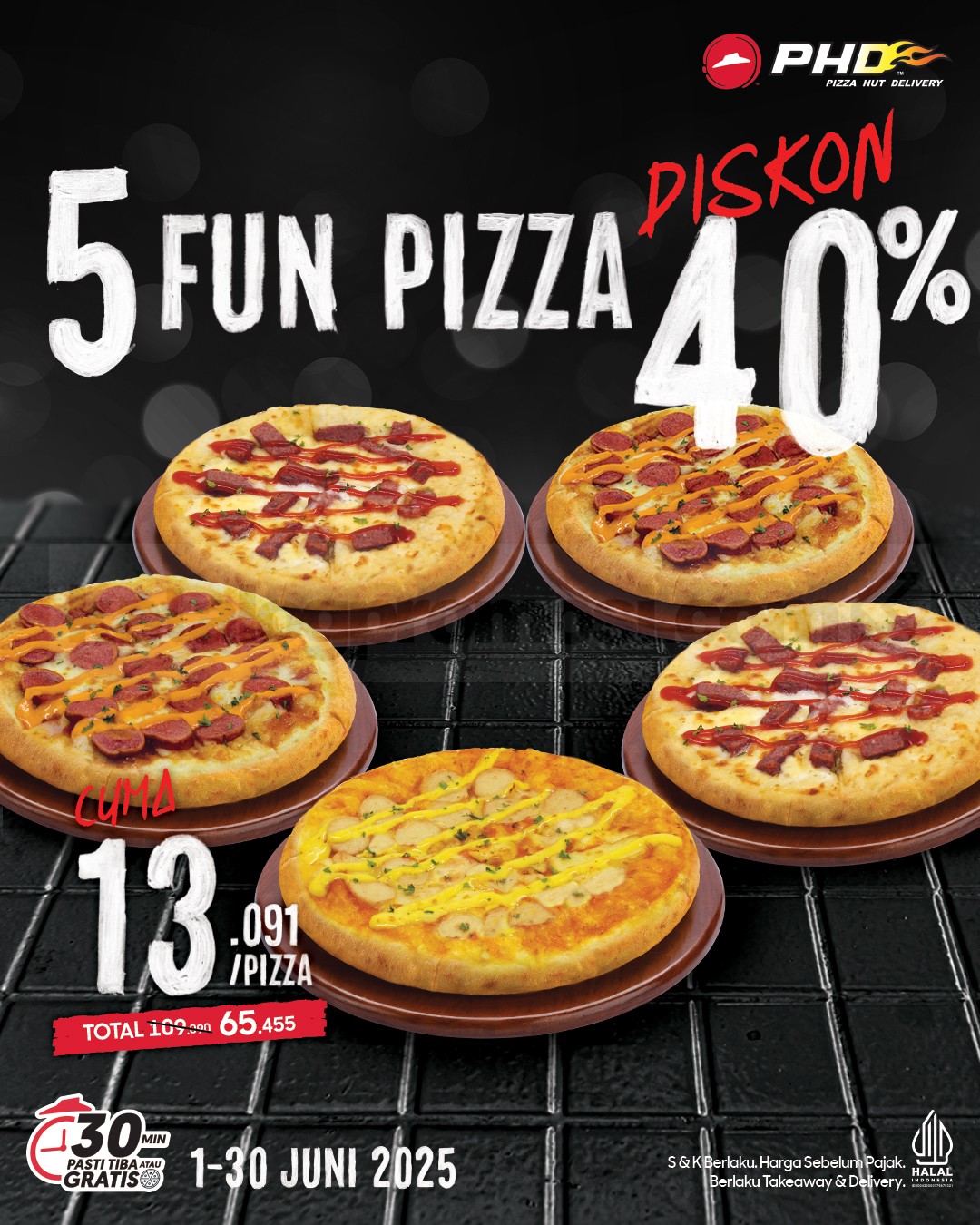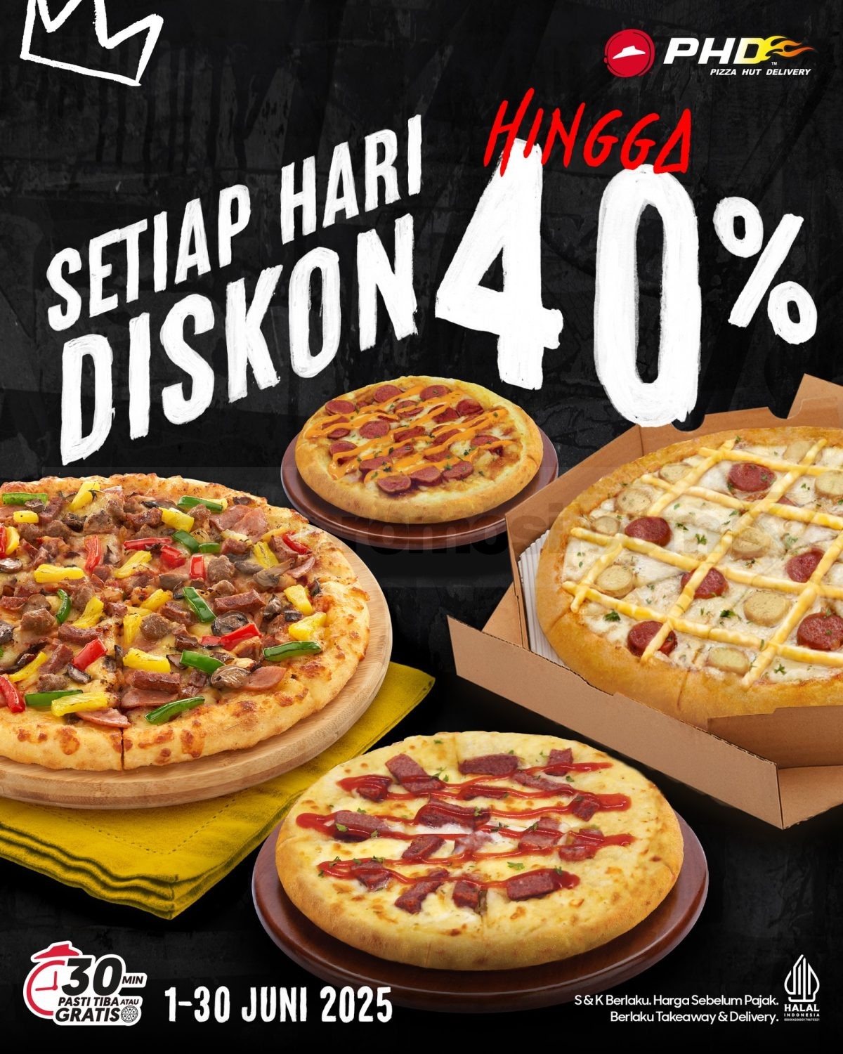 ⚠️ Jangan diskip! Buat kamu yang doyan pizza hemat, PHD punya promo spesial tiap hari selama Juni 2025! Diskon sampai 40%, bebas pilih promonya sesuai selera. Berlaku untuk pemesanan takeaway & delivery, bisa lewat: