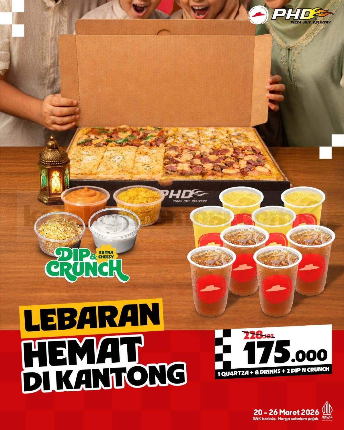 Promo PHD Lebaran Paket Hemat Rp. 175.000 paket pizza, 8 minuman, dan dip untuk sharing berlaku mulai tanggal 20 Maret 2026 – 26 Maret 2026.