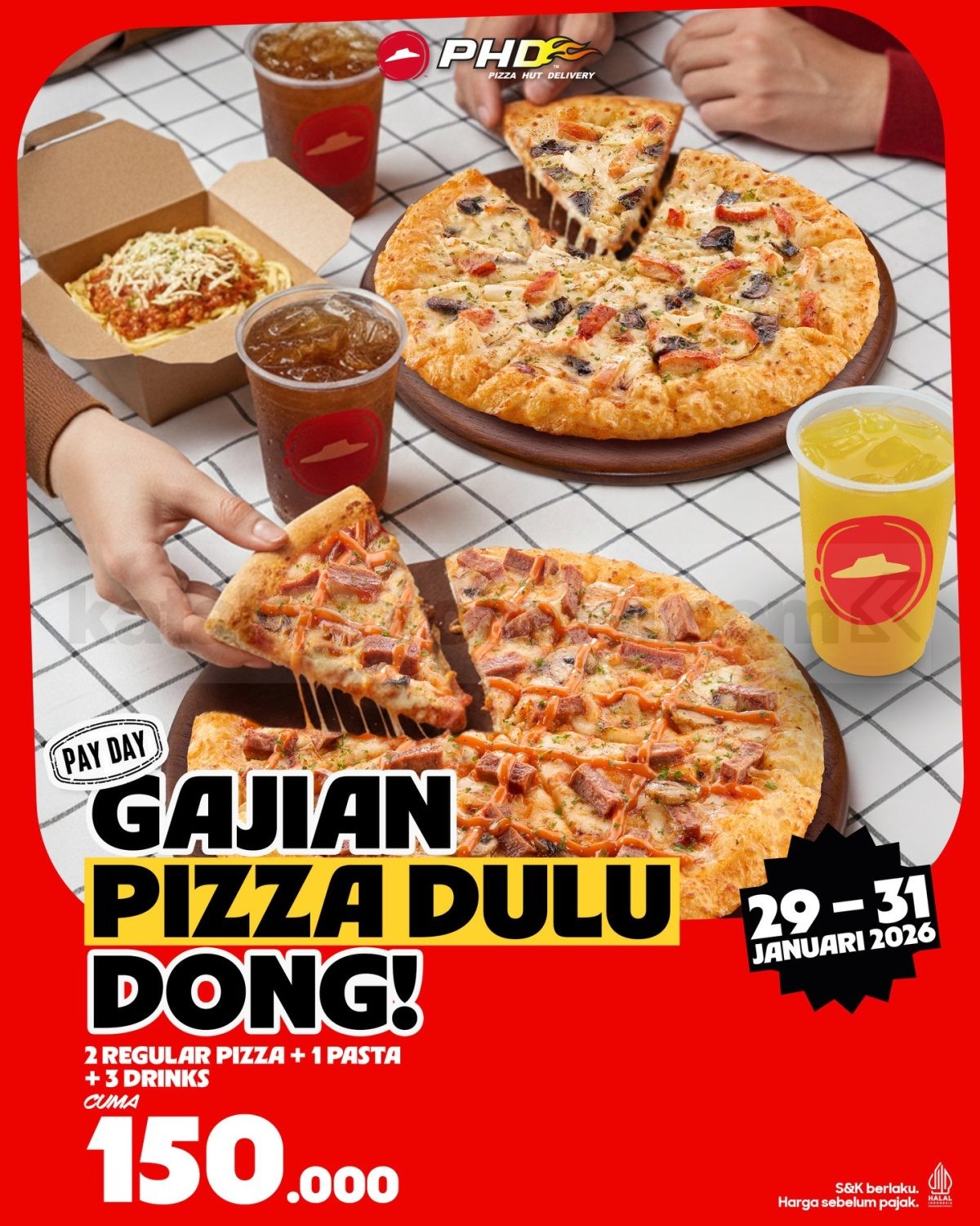 Promo PHD Pay Day Paket Bertiga Rp. 150.000 berlaku 29 – 31 Januari 2026 dengan isi 2 pizza, 1 pasta, dan 3 minuman, harga sebelum pajak.