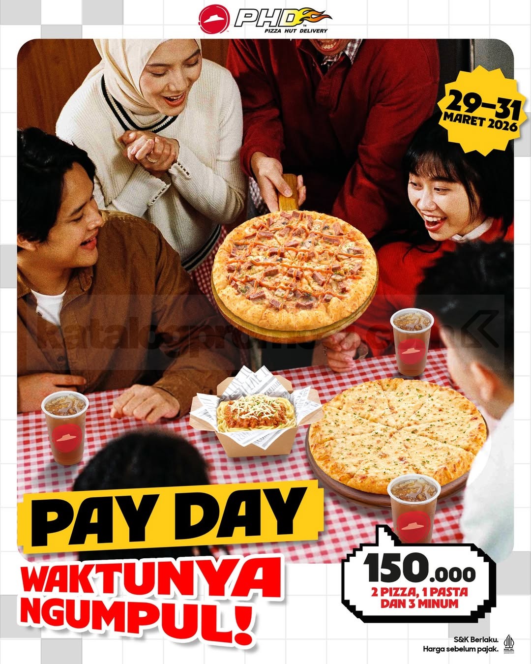 Promo PHD Pay Day Paket Hemat mulai Rp. 150.000, beli 2 pizza + 1 pasta + 3 lemon tea, berlaku 29-31 Maret 2026 di seluruh outlet.