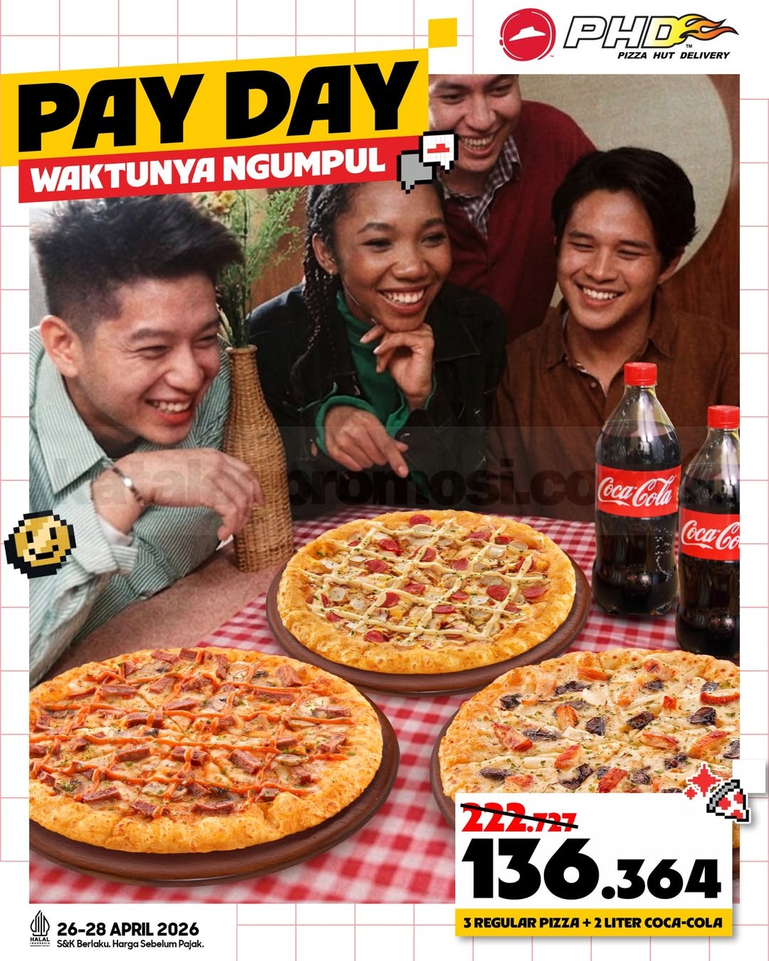 Promo PHD Pay Day Paket Hemat Rp. 136.364, dapat 1 Ultimate Pizza, 2 Favourite Pizza, dan 2L Coca-Cola berlaku mulai tanggal 26 April 2026 – 28 April 2026