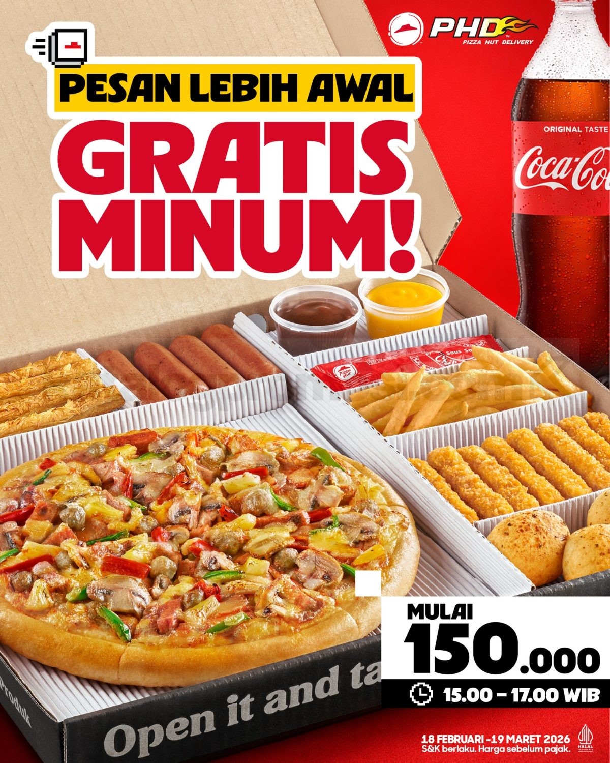 Promo PHD Ramadan Early Order Gratis Minuman periode 18 Februari – 19 Maret 2026 pukul 15.00 – 17.00 untuk pembelian Big Box.