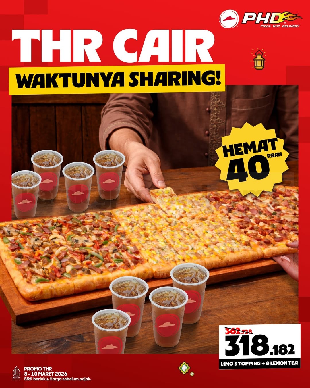 Promo PHD THR Paket Pizza Party Rp. 318.182 paket L1MO Pizza 3 Topping + 8 Lemon Tea untuk makan bareng, berlaku mulai tanggal 8 Maret 2026 – 10 Maret 2026 di seluruh outlet.