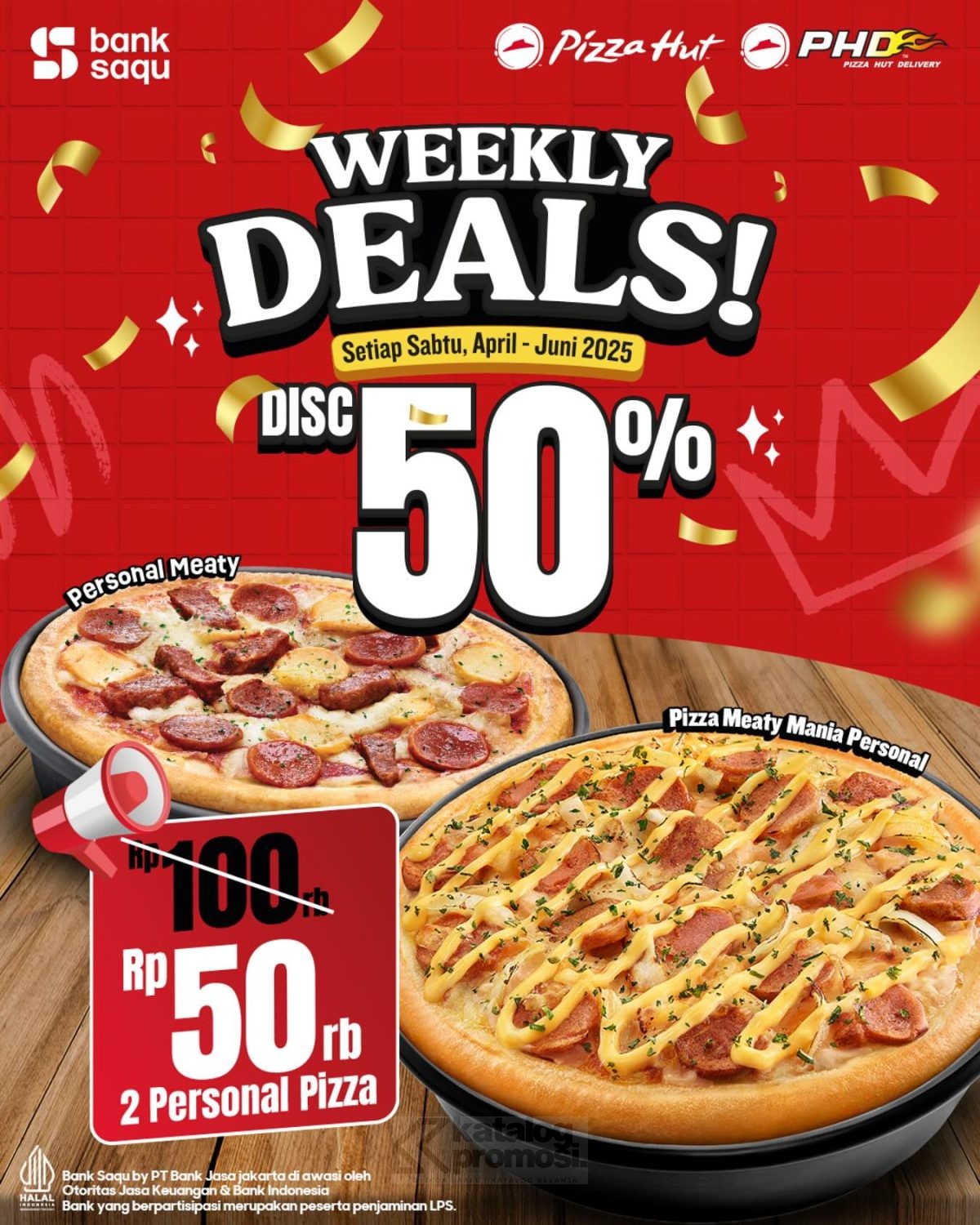 Promo Pizza Hut Diskon 50% bareng Bank Saqu: 2 Pan Personal Pizza cuma Rp. 50 RIBU setiap Sabtu April–Juni 2025. Berlaku dine-in & takeaway!