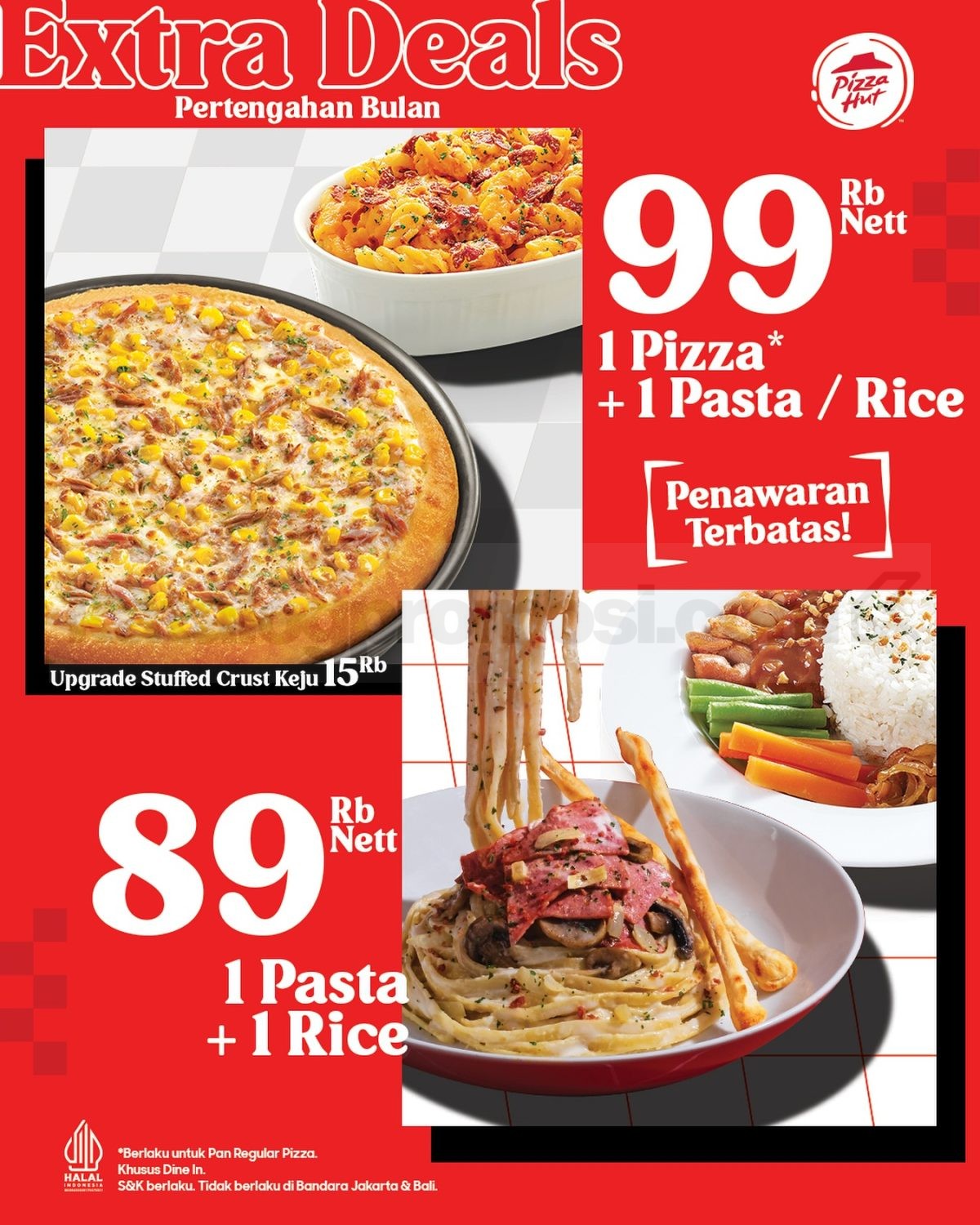 Promo Pizza Hut Extra Deals mulai Rp89.000 berlaku mulai tanggal 7 – 20 Juli 2025 khusus untuk dine-in di Pizza Hut Restaurant dan Ristorante. Nikmati paket hemat 1 Pan Regular Pizza plus 1 Pasta atau Rice hanya Rp99.000 nett atau 1 Pasta plus 1 Rice cuma Rp89.000 nett.