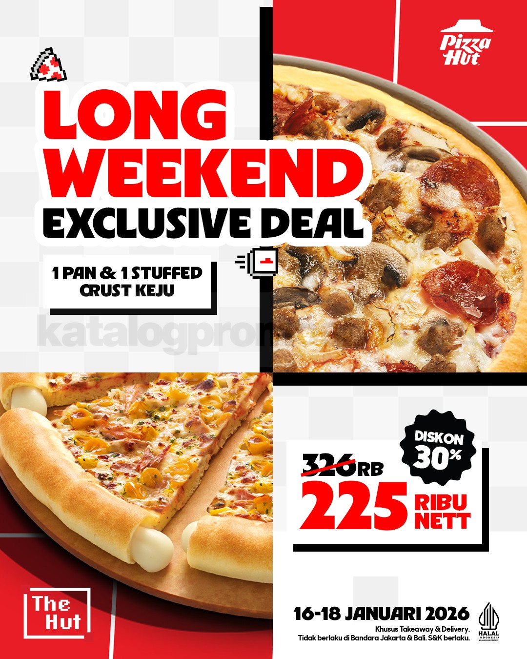 Promo Pizza Hut Long Weekend Exclusive Deal 2 Large Pizza Rp. 225.000 paket pizza rame-rame takeaway dan delivery berlaku mulai tanggal 16 Januari 2026 – 18 Januari 2026 di seluruh outlet