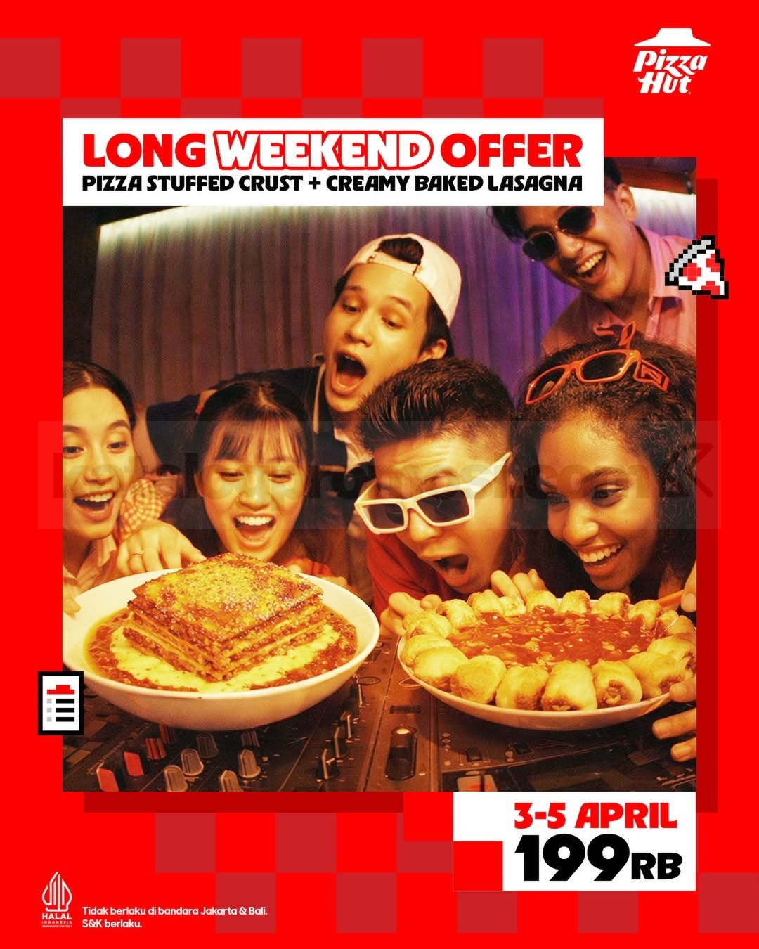 Promo Pizza Hut Long Weekend Pizza & Lasagna Rp. 199 ribu paket pizza stuffed crust dan lasagna berlaku mulai tanggal 3 April – 5 April 2026 di seluruh outlet