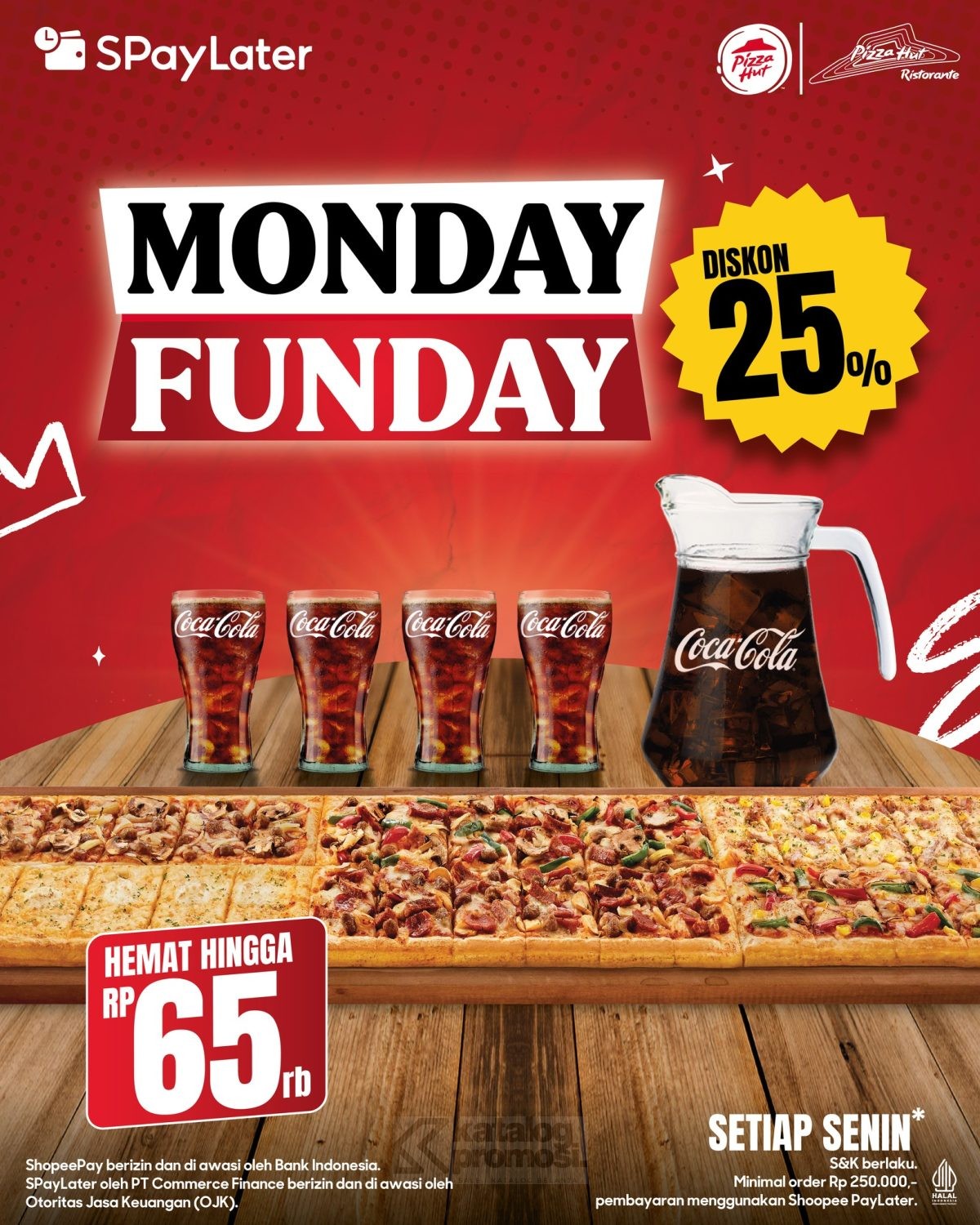 Senin, waktunya makan pizza sambil happy! ππ Dapatkan Promo Monday Funday di Pizza Hut dan nikmati diskon 25% untuk setiap dine-in, cuma di hari Senin! Kamu cuma perlu menghabiskan minimal Rp250.000 dan bayar pakai SPayLater. Bisa hemat sampai Rp65.000! π€