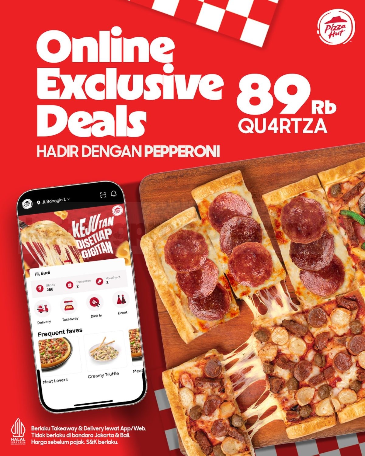 Dapetin QU4RTZA Pizza favorit cuma Rp. 89.000, khusus pembelian takeaway atau delivery via www.pizzahut.co.idΒ atau Aplikasi Pizza Hut Indonesia.