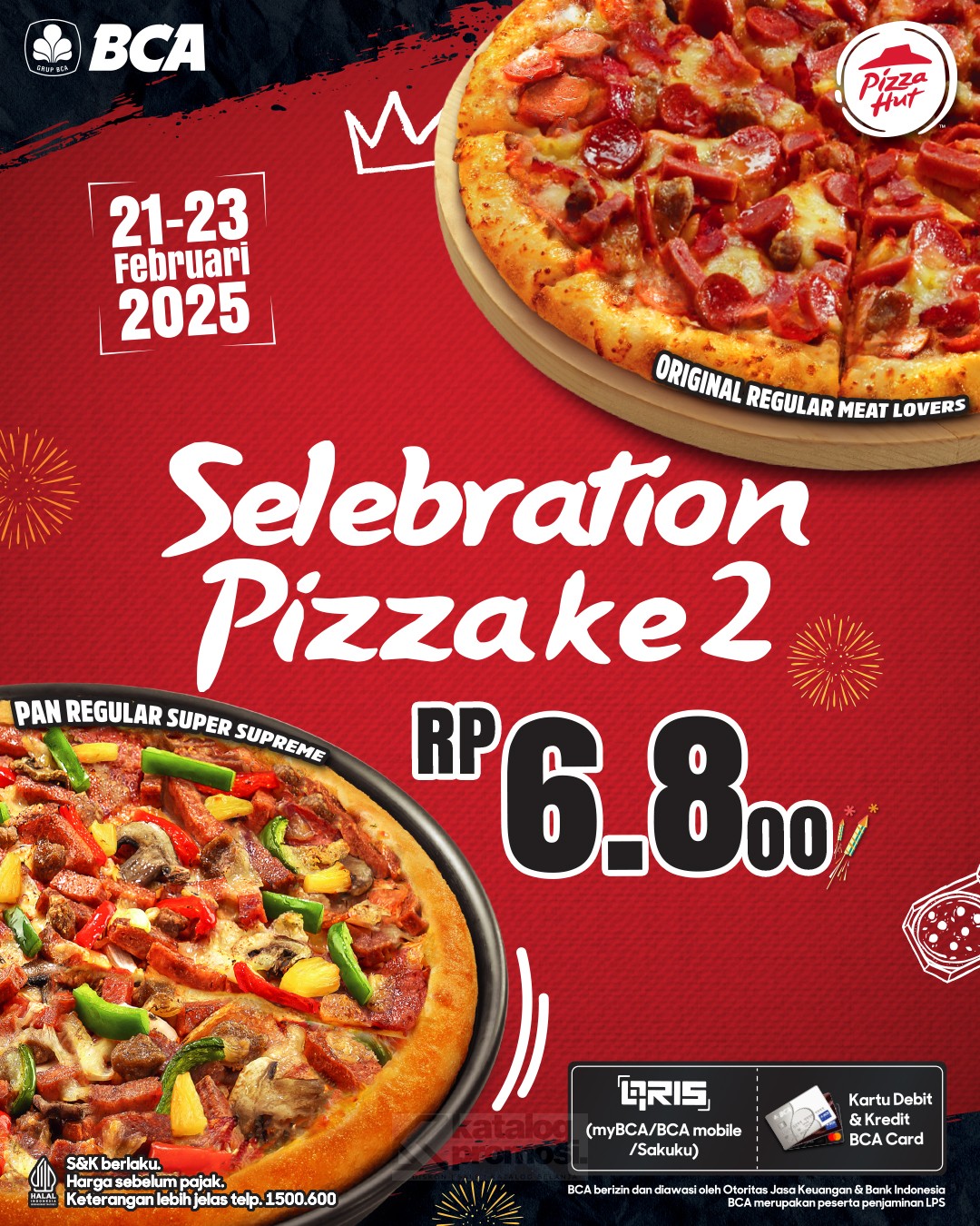 Rayakan HUT BCA ke-68 dengan promo spesial dari PIZZA HUT! Hanya pada 21-23 Februari 2025, setiap pembelian pizza regular/large/QU4RTZA/L1MO dengan pinggiran & topping apa saja, kamu bisa mendapatkan pizza kedua seharga Rp6.800 aja! ✨