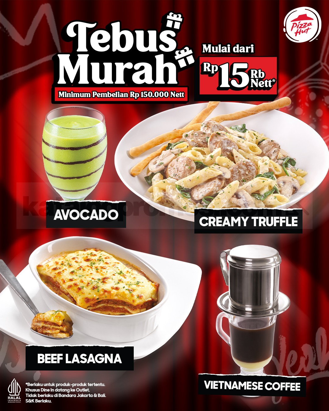 Sementara buat kamu yang nongkrong di Pizza Hut Ristorante, dengan pembelian minimal sama, bisa pilih menu tebus murah berikut ini: