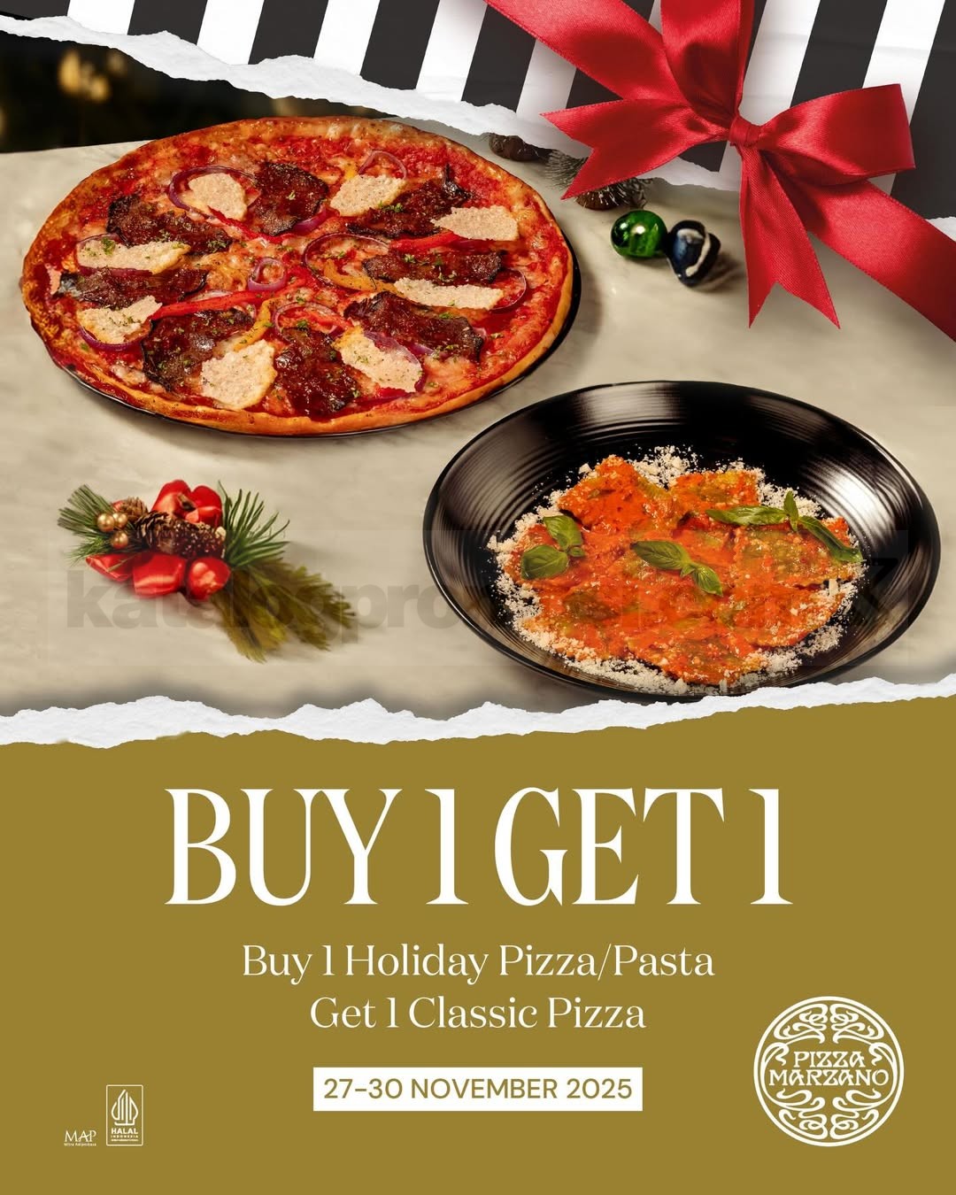 Promo Pizza Marzano Buy 1 Get 1 Free Holiday Menu nikmati pizza/pasta spesial liburan, beli 1 dapat 1 gratis, berlaku 27–30 November 2025 di seluruh outlet.