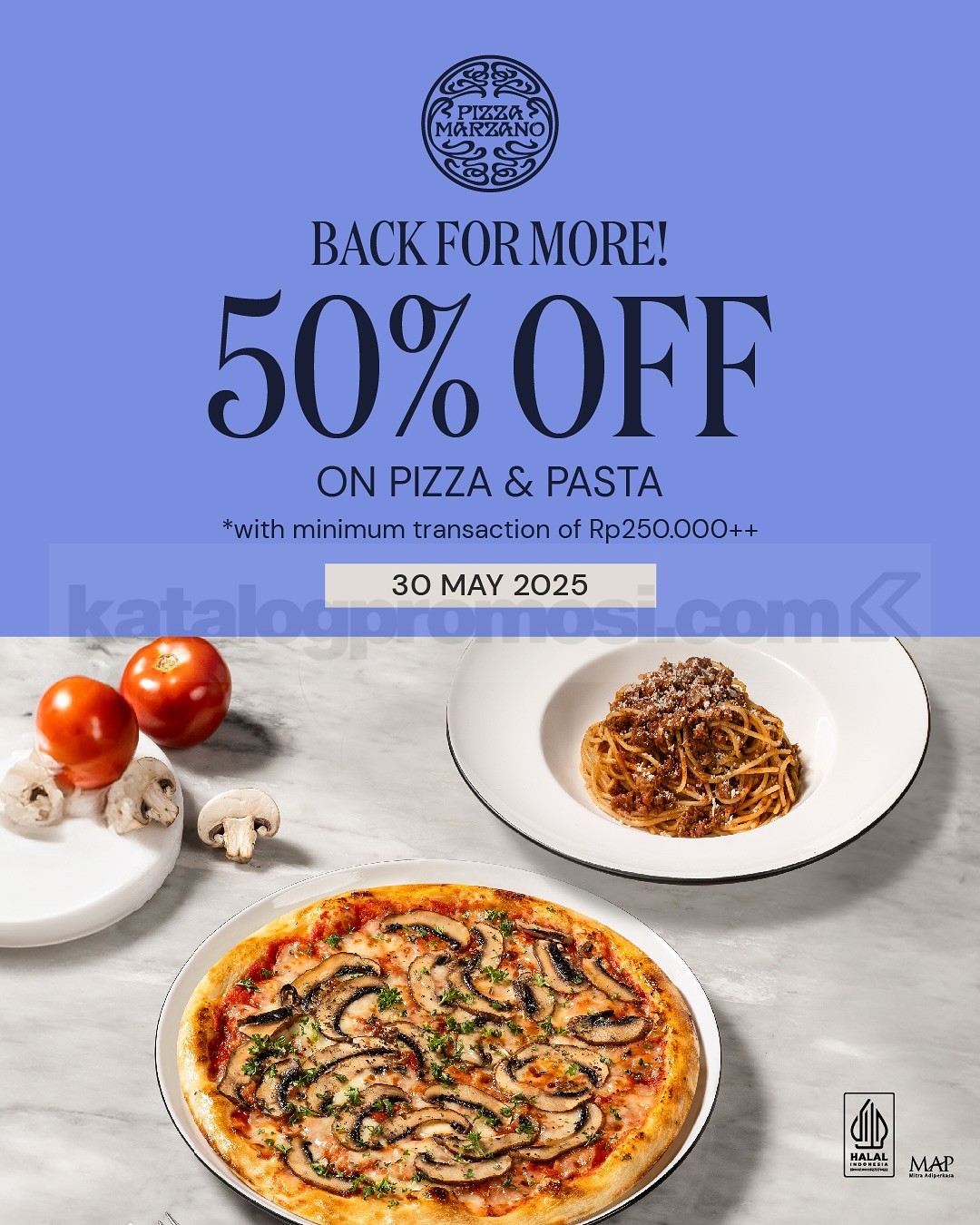 Promo Pizza Marzano Weekend Deals diskon 50% untuk classic pizza dan pasta berlaku 20–21 September 2025 di berbagai outlet Pizza Marzano.