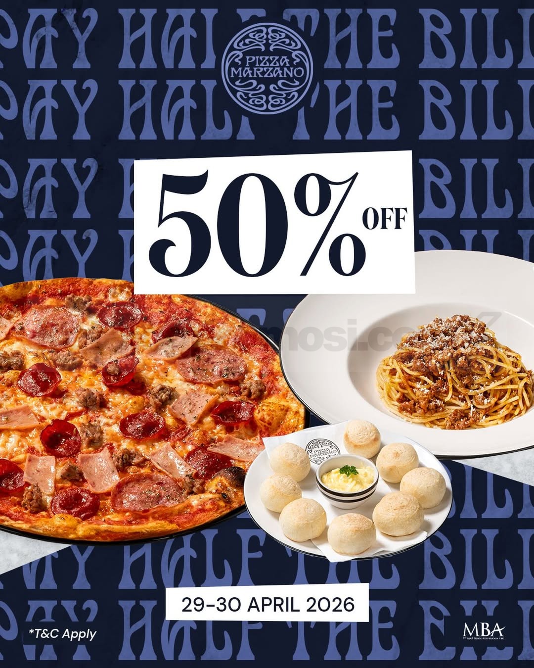 Promo Pizza Marzano Diskon 50% Semua Menu potongan setengah harga total bill dine in berlaku mulai tanggal 29 April 2026 – 30 April 2026 di seluruh outlet