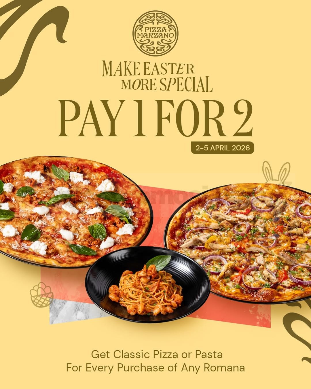 Promo Pizza Marzano Easter beli 1 gratis 1 menu, nikmati Romana Pizza dan gratis Classic Pizza atau Pasta berlaku 2 April 2026 – 5 April 2026 di seluruh outlet