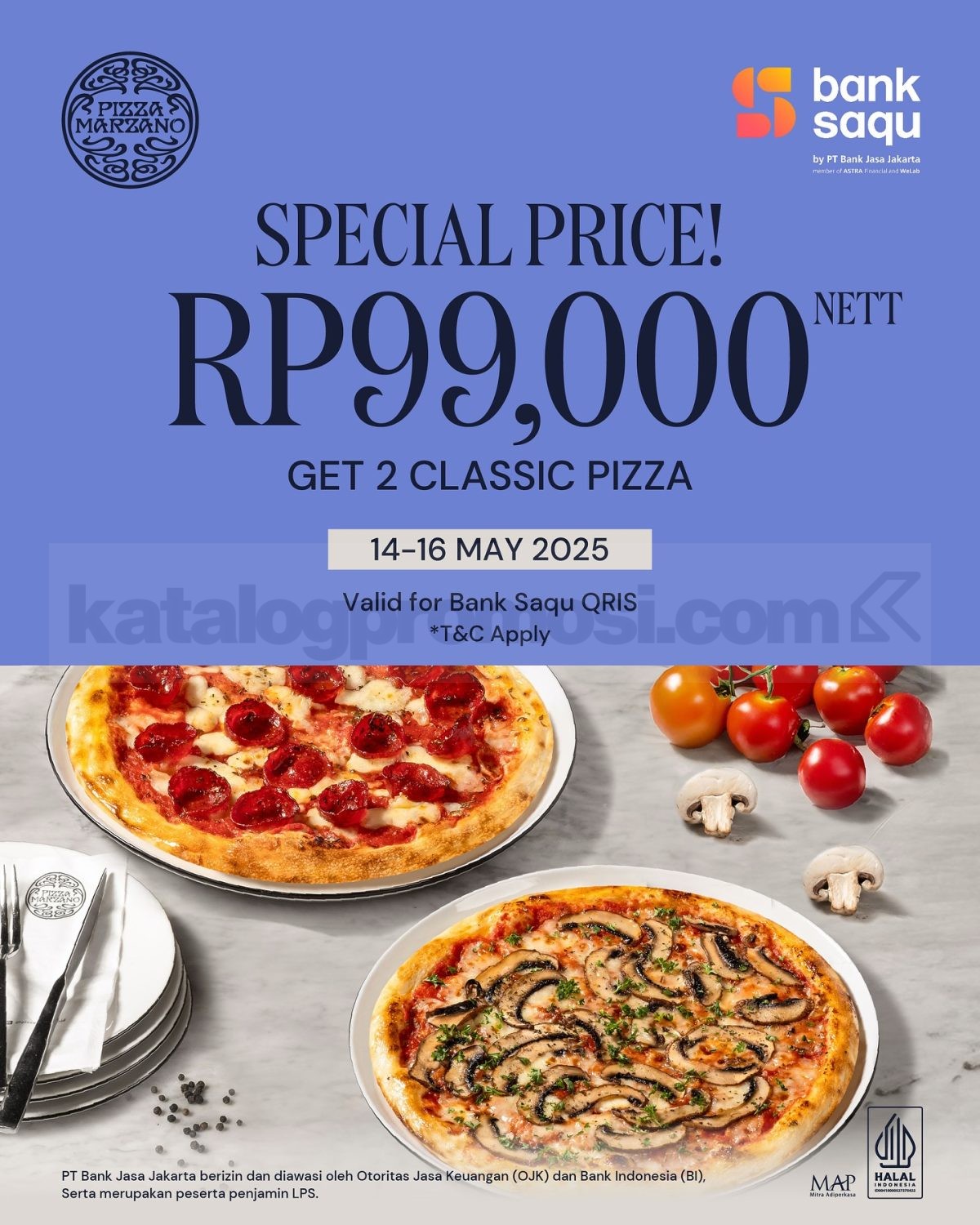 Promo Ka99et Bank Saqu: Dapatkan 2 Classic Pizza di Pizza Marzano cuma Rp 99.000 pakai QRIS! Berlaku 14β16 Mei 2025.
