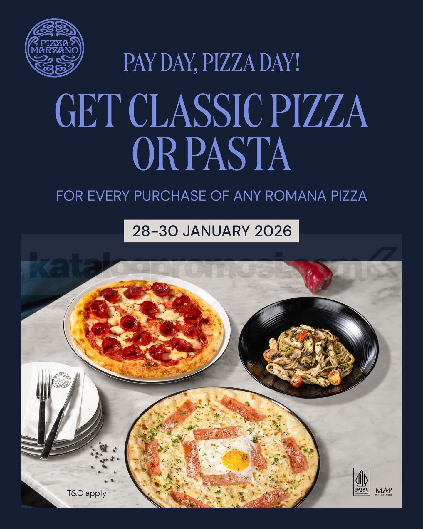 Promo Pizza Marzano Payday Pizza Day beli Romana Pizza gratis Classic Pizza atau Pasta, makan lebih puas dine in, berlaku 28 Januari 2026 – 30 Januari 2026.