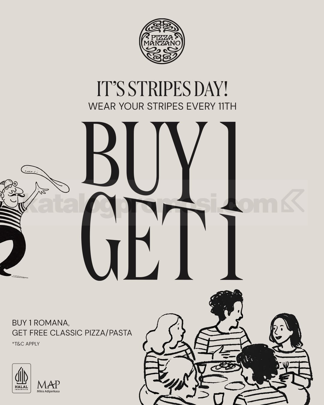 Promo Pizza Marzano Stripes Day beli 1 gratis 1 hanya di tanggal 11 Januari 2026, beli Romana Pizza gratis Classic Pizza atau Pasta untuk dine in.