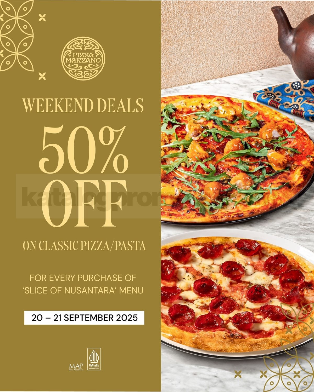 Promo Pizza Marzano Weekend Deals diskon 50% untuk classic pizza dan pasta berlaku 20–21 September 2025 di berbagai outlet Pizza Marzano.