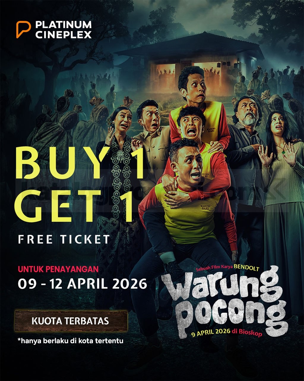 Promo Platinum Cineplex Beli 1 Gratis 1 Tiket Warung Pocong, berlaku mulai tanggal 9 April 2026 – 12 April 2026 di kota tertentu.