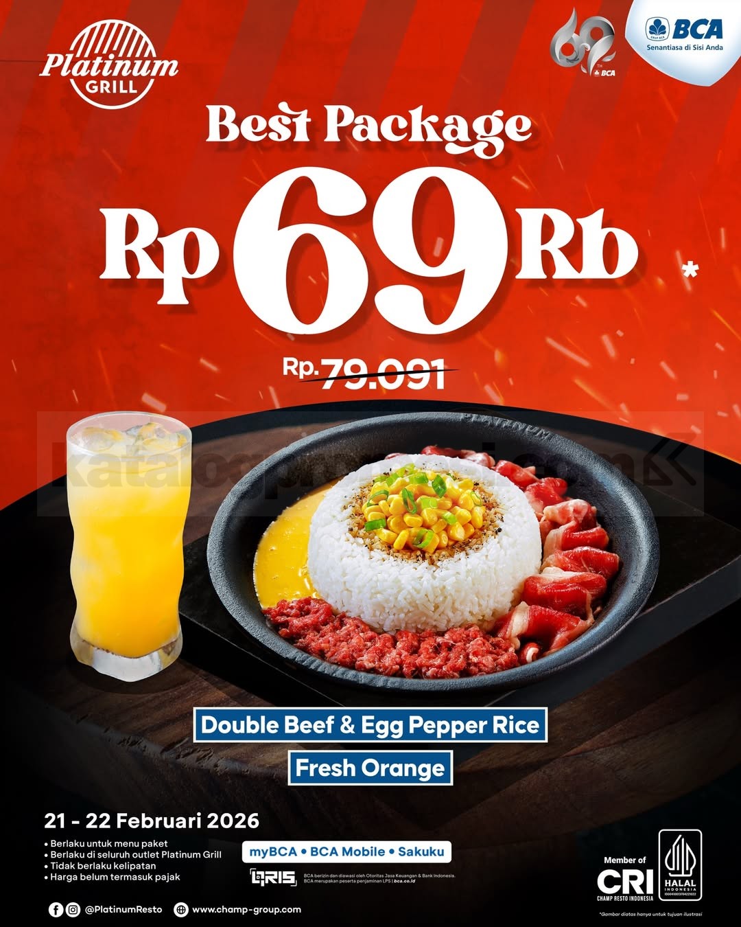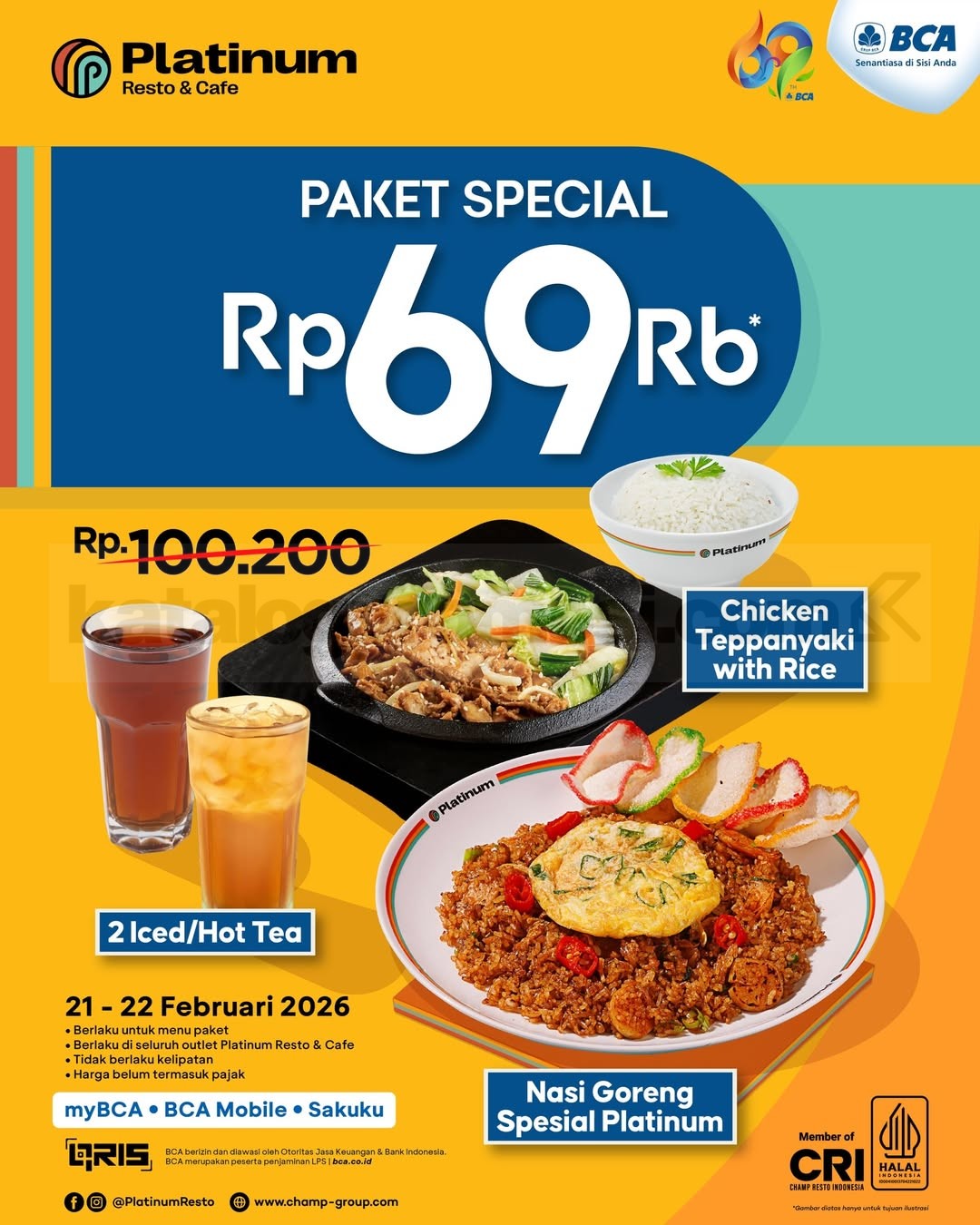 Promo Platinum HUT BCA ke-69 Paket Rp. 69 ribu dengan menu best seller + minum, bayar via myBCA, BCA Mobile & Sakuku, berlaku mulai tanggal 21 Februari 2026 – 22 Februari 2026.