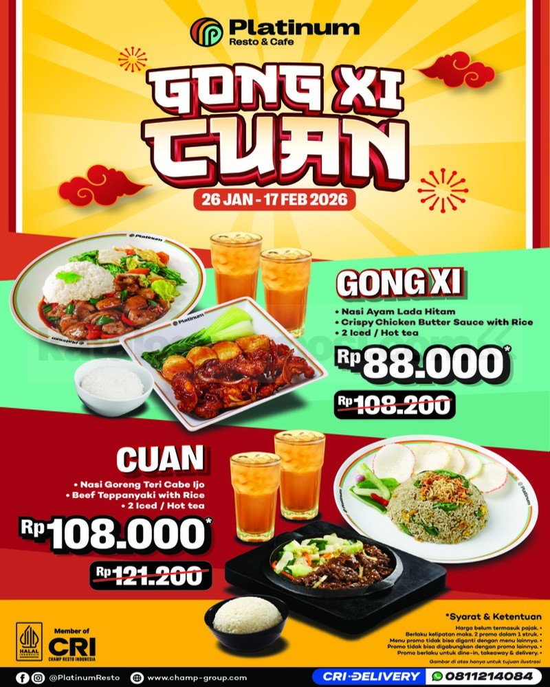 Promo Platinum Resto & Cafe Gong Xi Cuan paket lengkap Mulai Rp. 88.000 menawarkan pilihan paket makan dan minum berdua yang praktis dan hemat, berlaku 26 Januari 2026 – 17 Februari 2026.