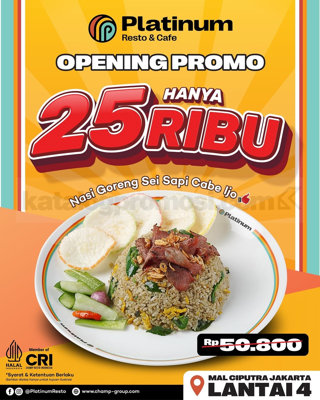Promo Platinum Resto & Cafe Grand Opening Nasi Goreng Sei Sapi Cabe Ijo Rp 25Ribu, nikmati menu best seller hanya Rp.25.000, berlaku 17โ30 November 2025