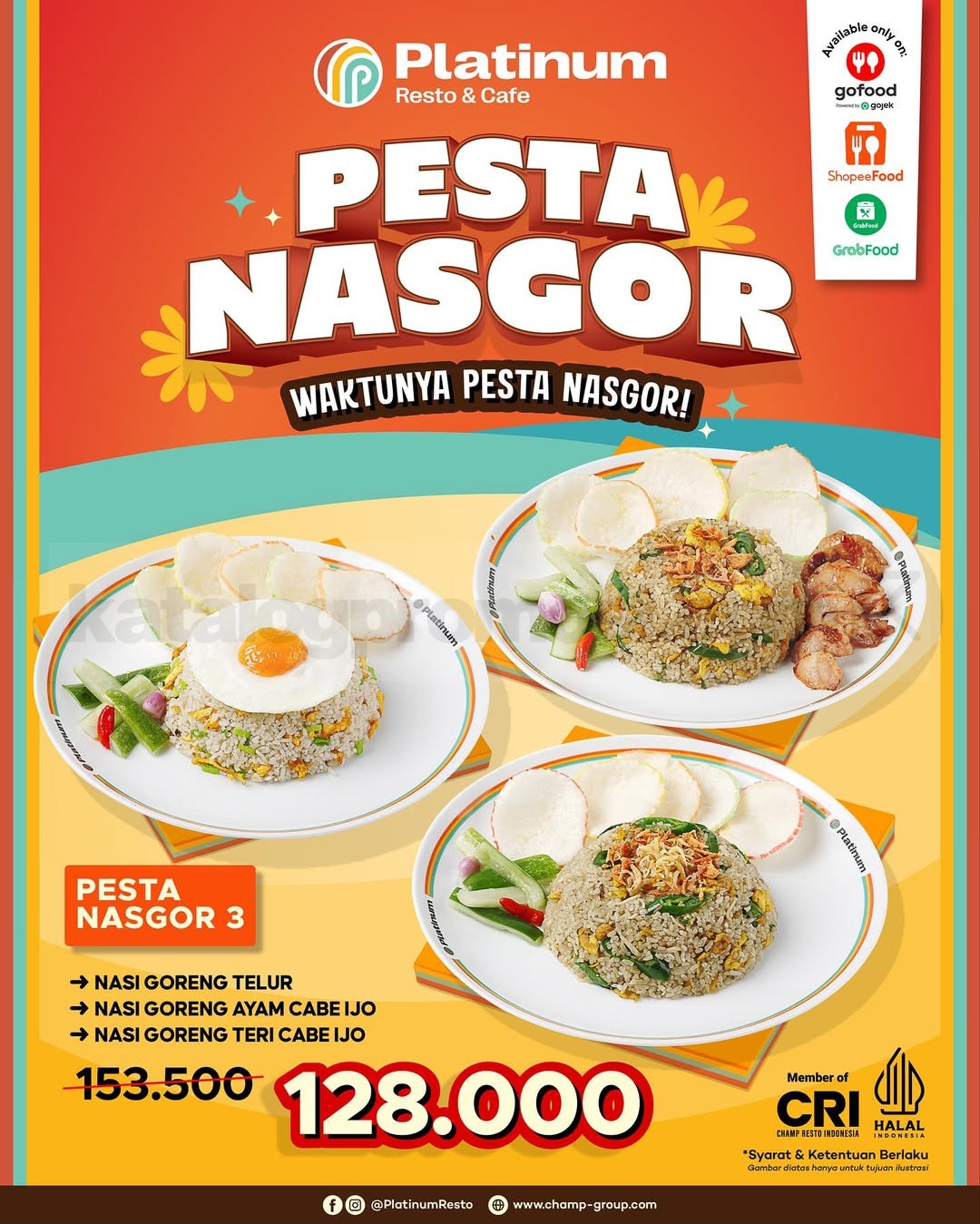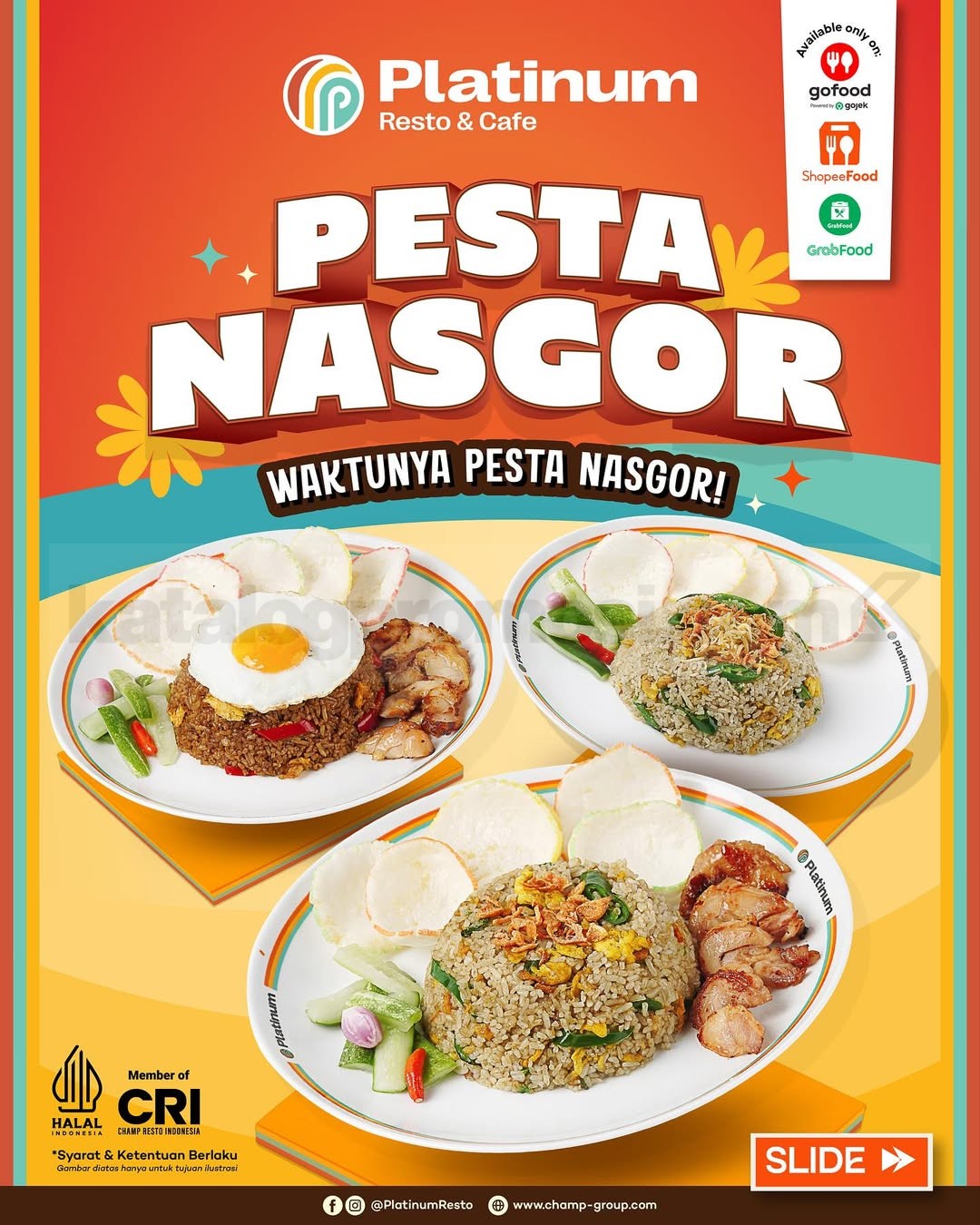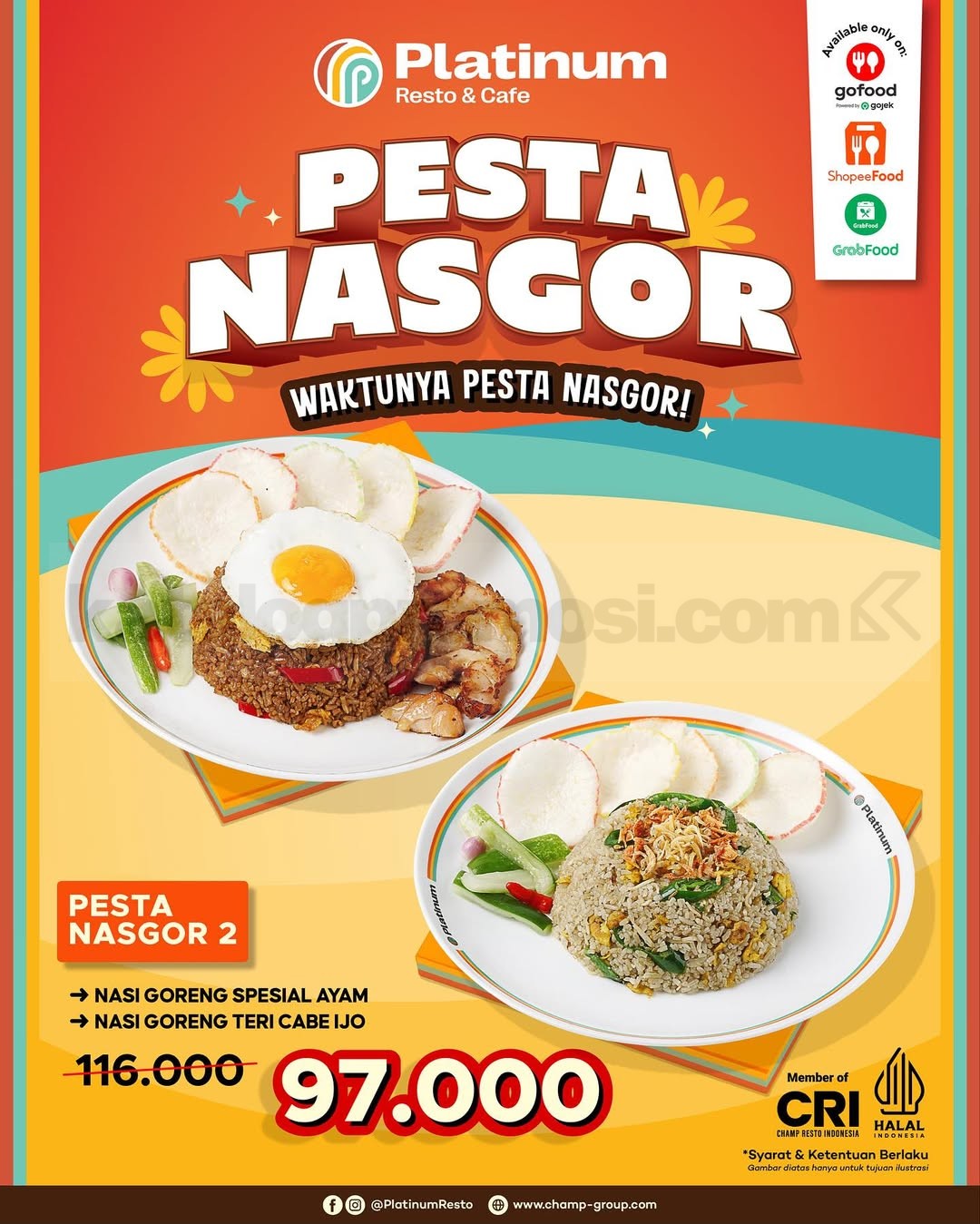 Promo Platinum Resto & Café Pesta Nasgor mulai Rp. 50.000 dengan berbagai menu nasi goreng spesial, berlaku 1–30 November 2025 via GoFood, GrabFood, dan ShopeeFood.