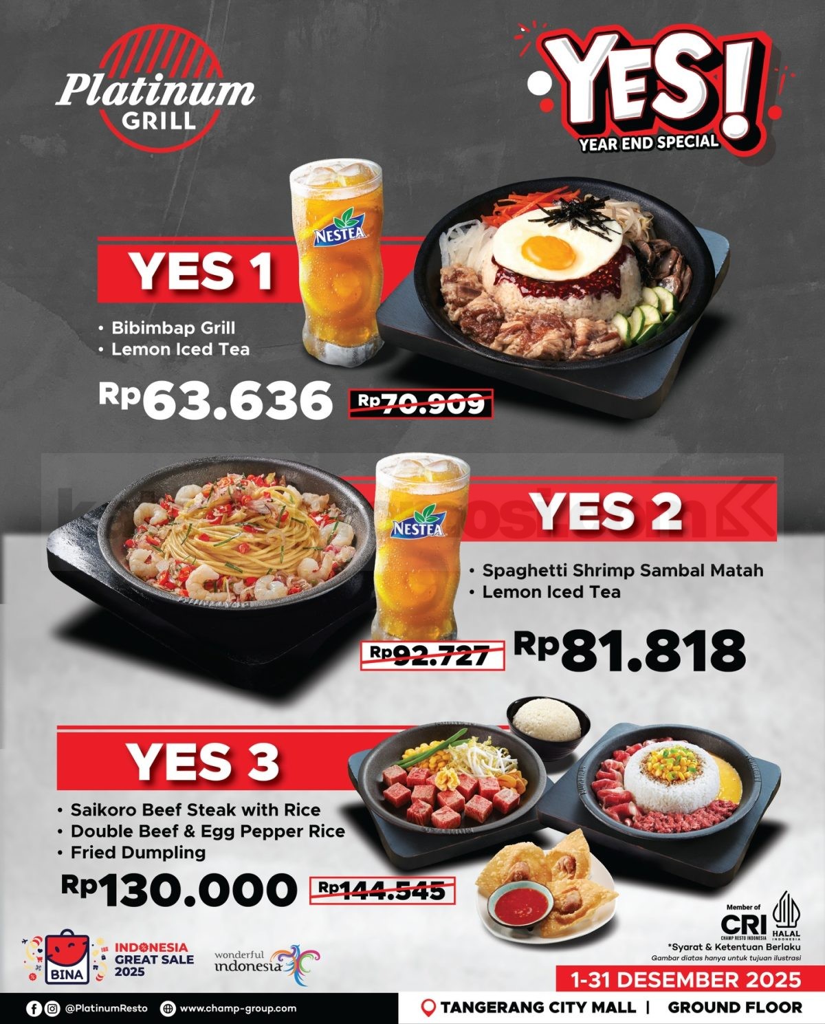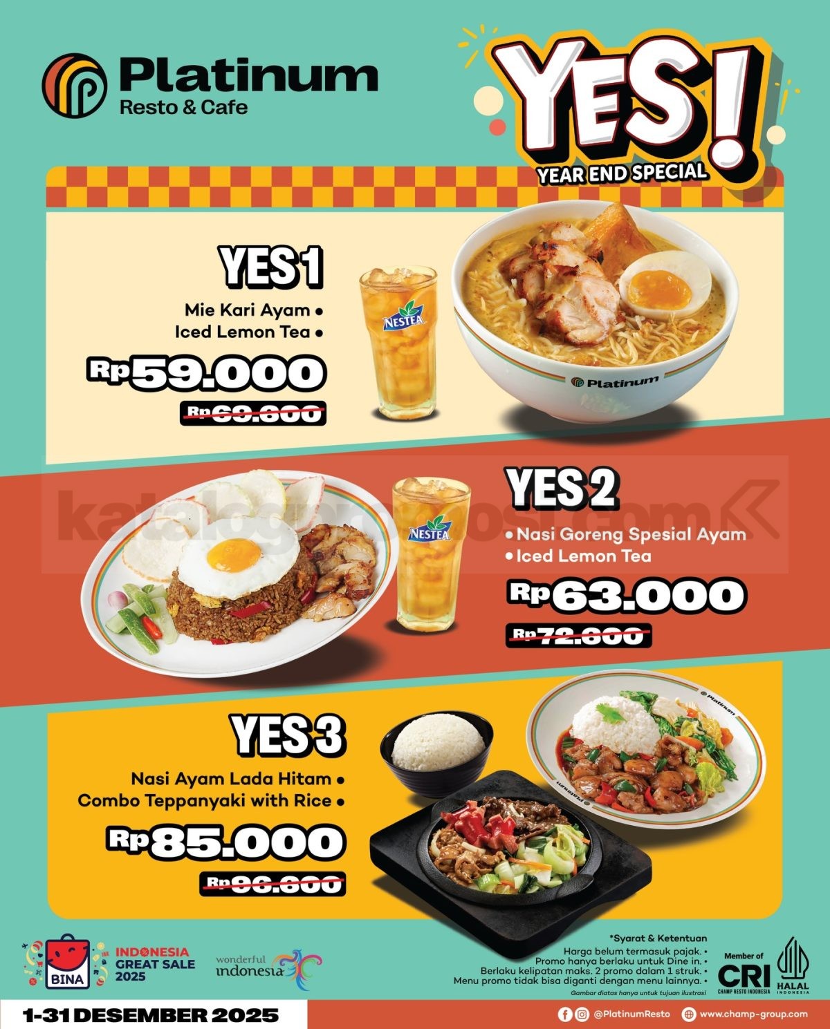 Promo Platinum Resto & Cafe Year End Special mulai Rp. 48.000, nikmati paket best seller lengkap + minuman segar, berlaku 1–31 Desember 2025.