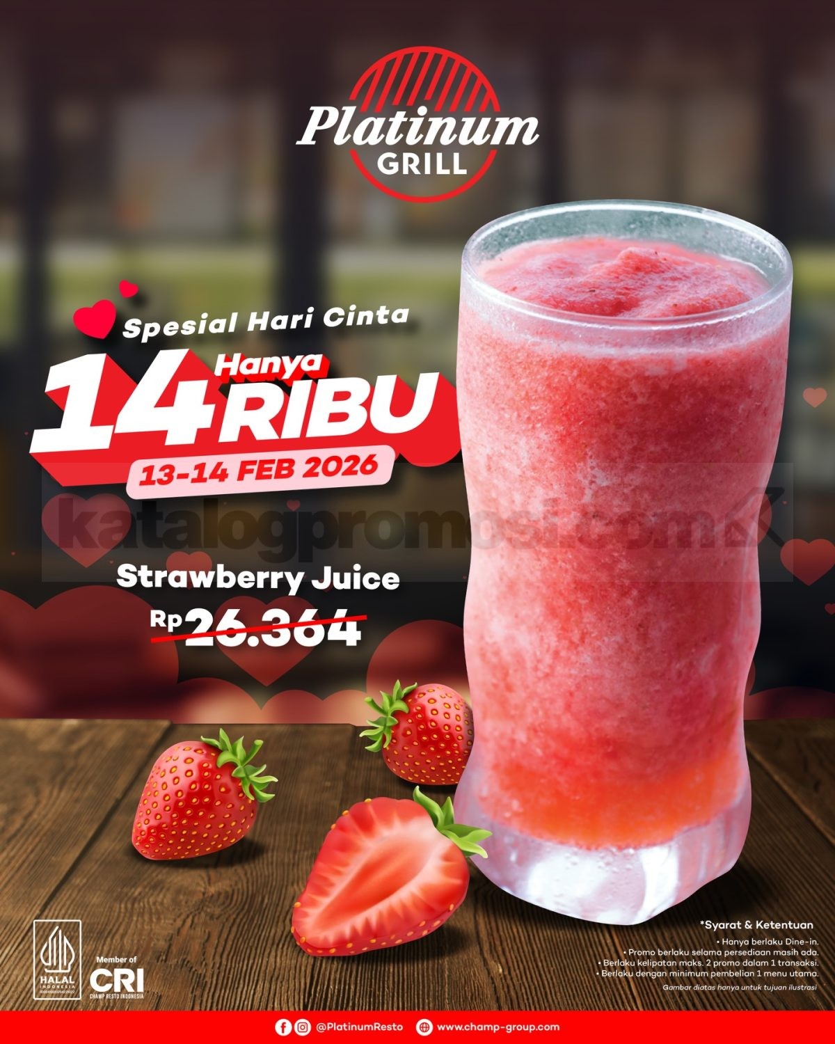 Promo Platinum Resto Valentine Strawberry Juice Rp. 14.000 dengan min. beli 1 menu utama, berlaku mulai tanggal 13 Februari 2026 – 14 Februari 2026 di seluruh outlet.