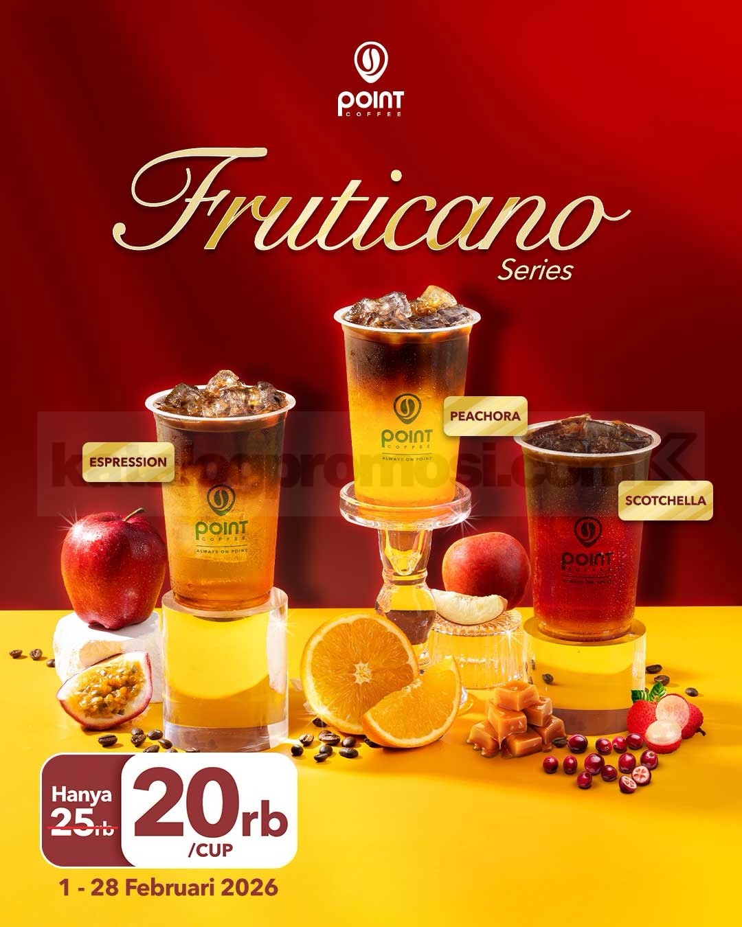 Promo Point Coffee Fruticano Series Harga Spesial Rp. 20.000 dengan 3 varian kopi buah berlaku mulai tanggal 1 Februari 2026 – 28 Februari 2026