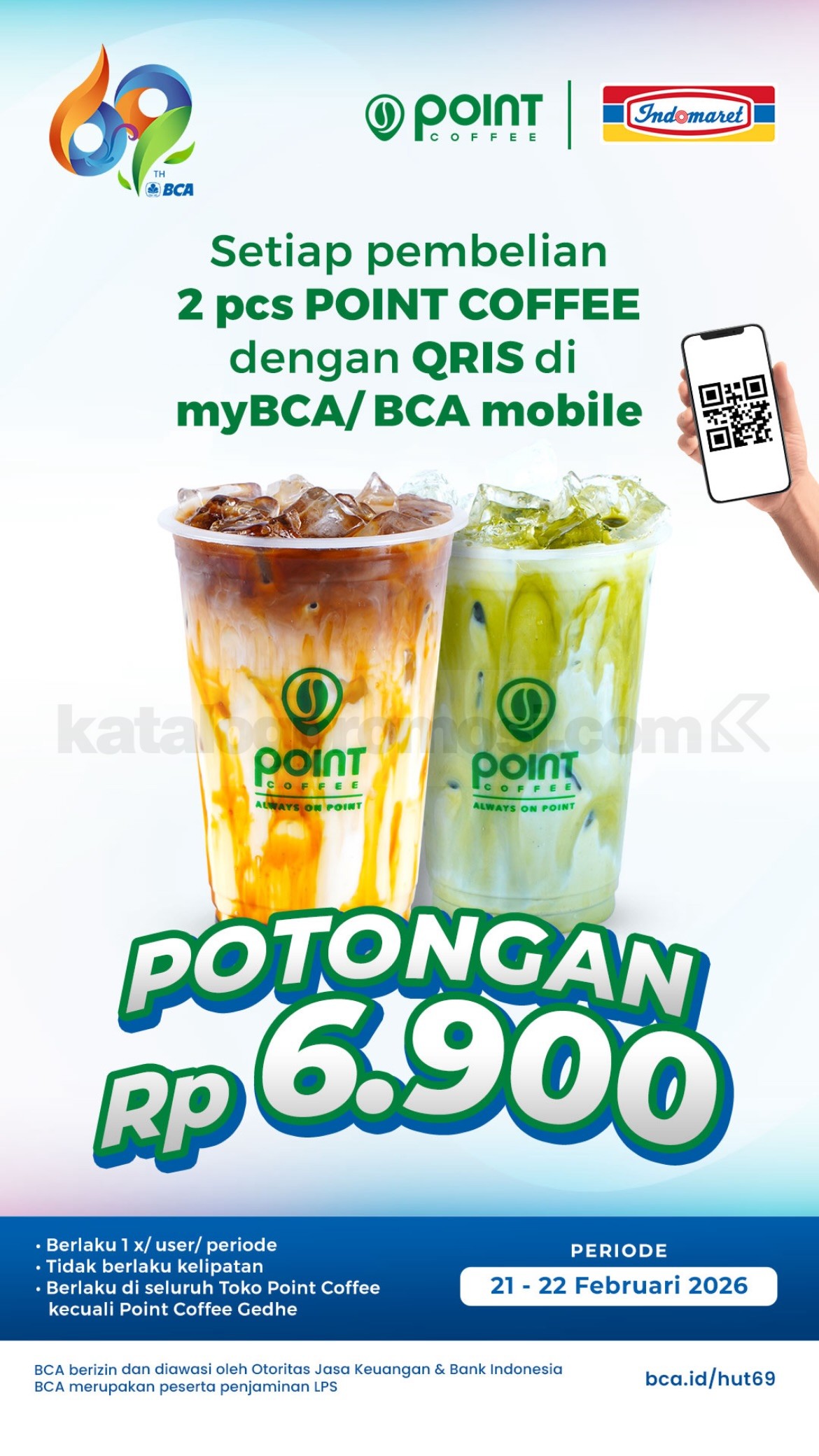 Promo Point Coffee HUT BCA 69 Diskon Rp. 6.900 periode 21 – 22 Februari 2026 pembelian 2 minuman iced transaksi QRIS myBCA atau BCA mobile.