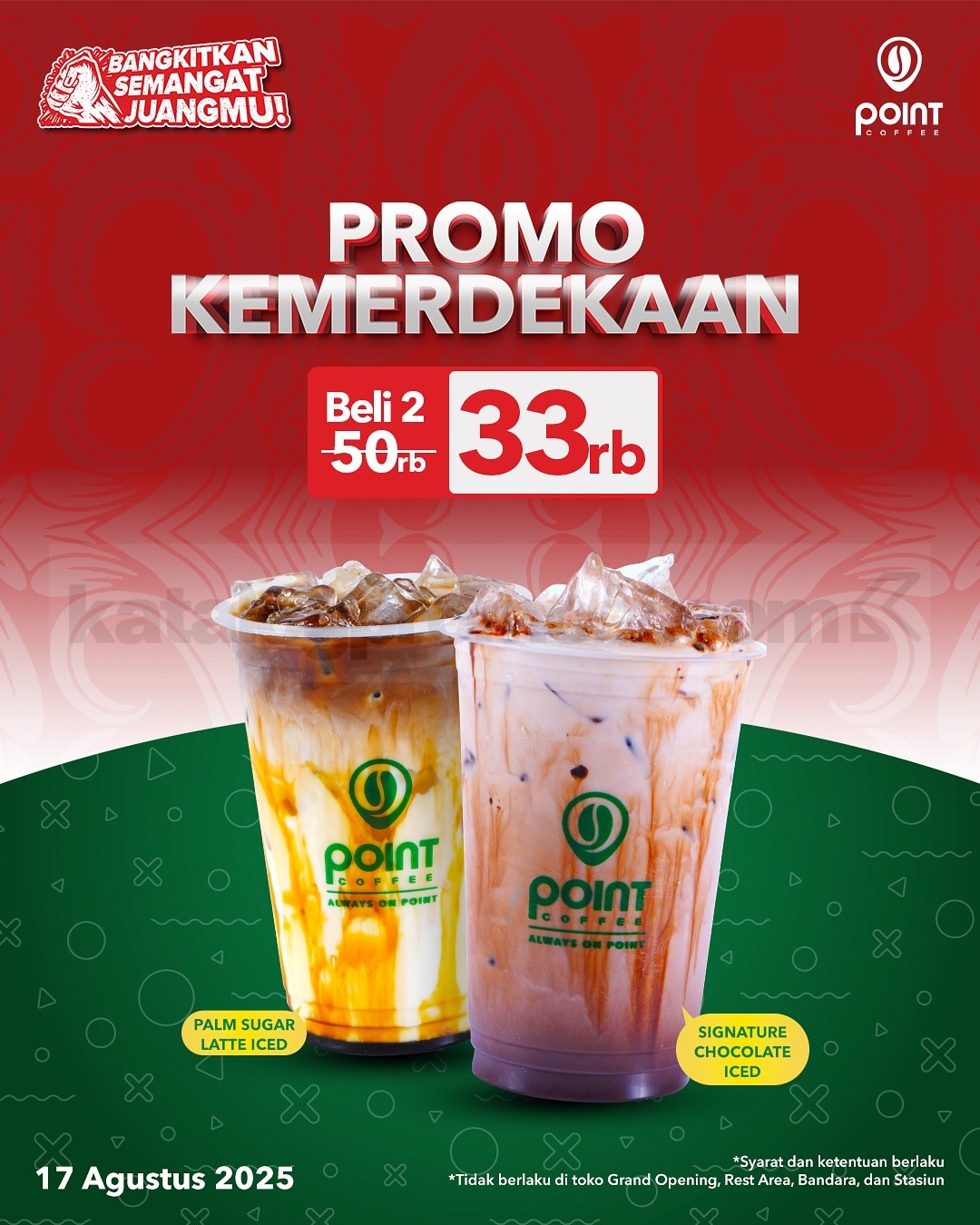 Promo Point Coffee Merdeka 2 minuman Rp33.000 untuk Palm Sugar Latte Iced dan Signature Chocolate Iced berlaku khusus di tanggal 17 Agustus 2025.