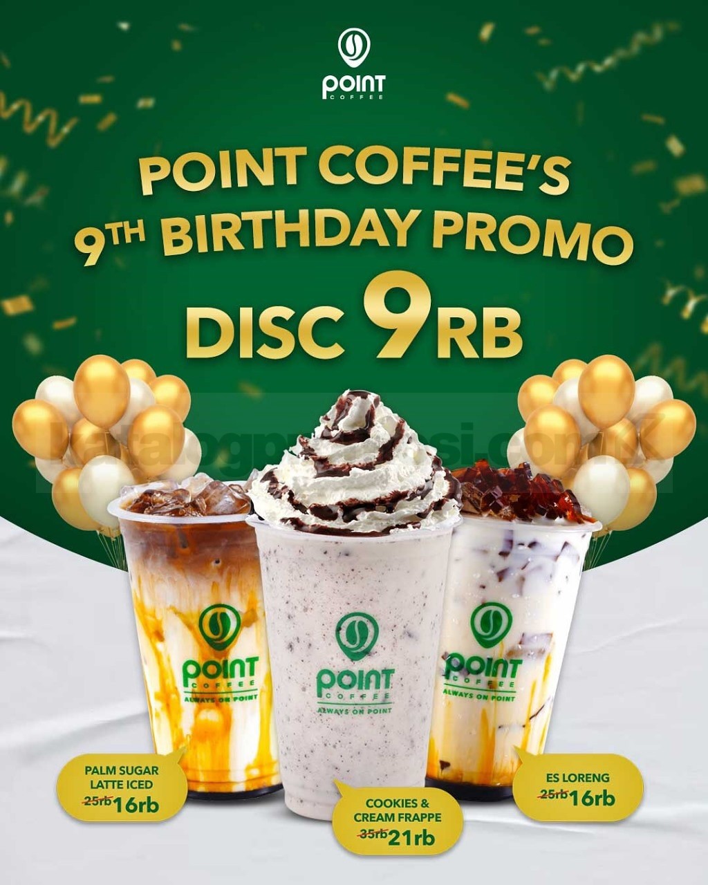Promo ulang tahun Point Coffee ke-9 hanya 30 Mei 2025! Nikmati minuman favorit seperti Cookies & Cream Frappe dan Es Loreng SEMUA DISKON 9RIBU !