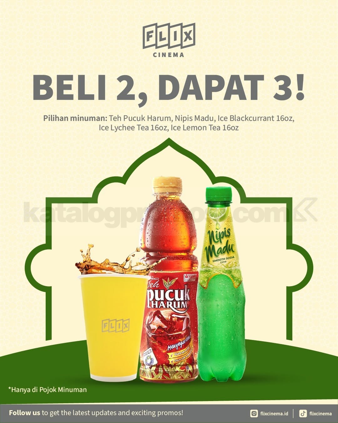Promo Pojok Minuman FLIX Cinema Beli 2 Dapat 3 gratis 1 minuman setiap beli 2 minuman pilihan berlaku mulai tanggal 18 Februari 2026 – 20 Maret 2026 di Pojok Minuman FLIX Cinema.