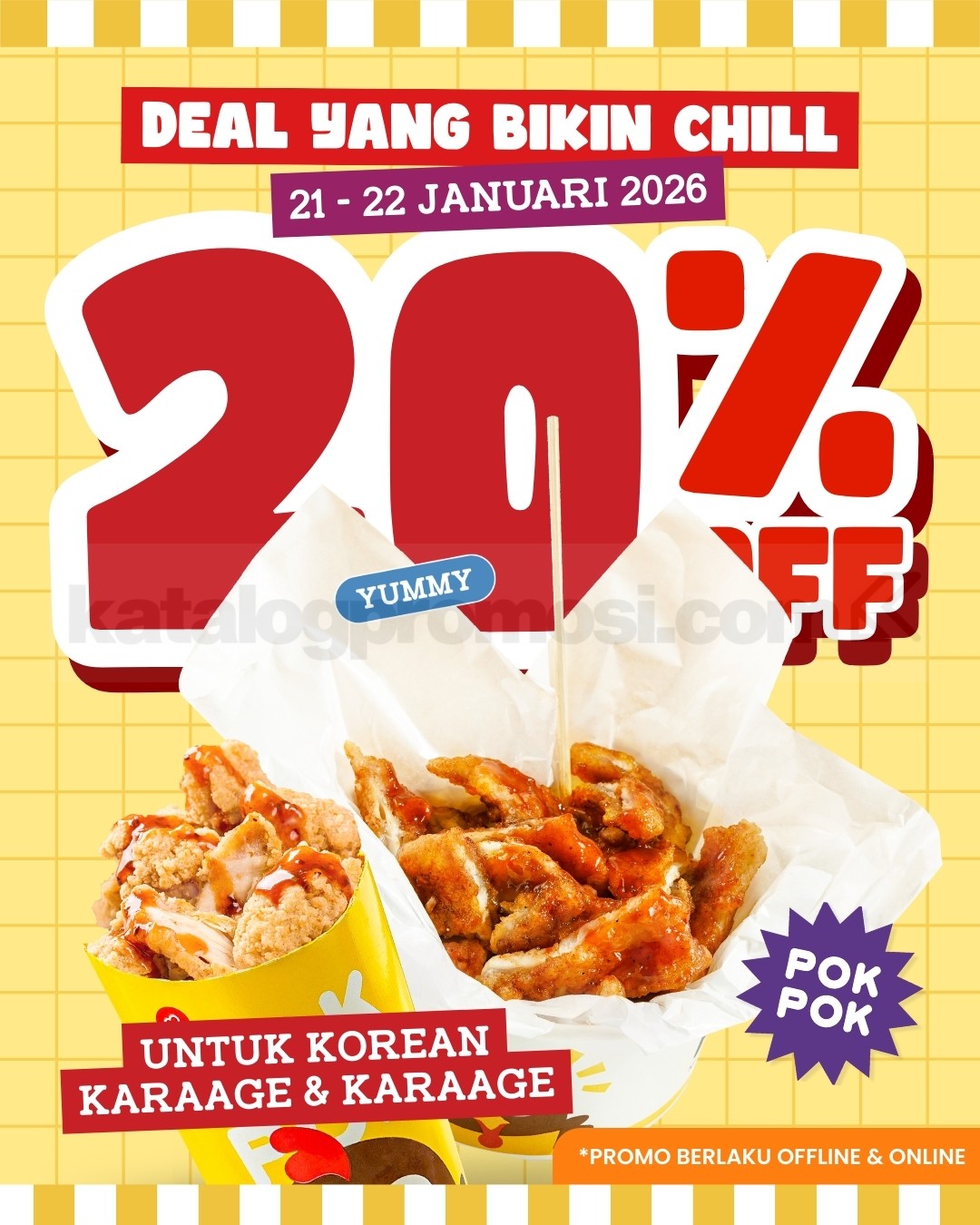 Promo POKPOK DEAL Korean Karaage Diskon 20% untuk menu Korean Karaage & Karaage, berlaku mulai tanggal 21 Januari 2026 – 22 Januari 2026 di lokasi tertentu.