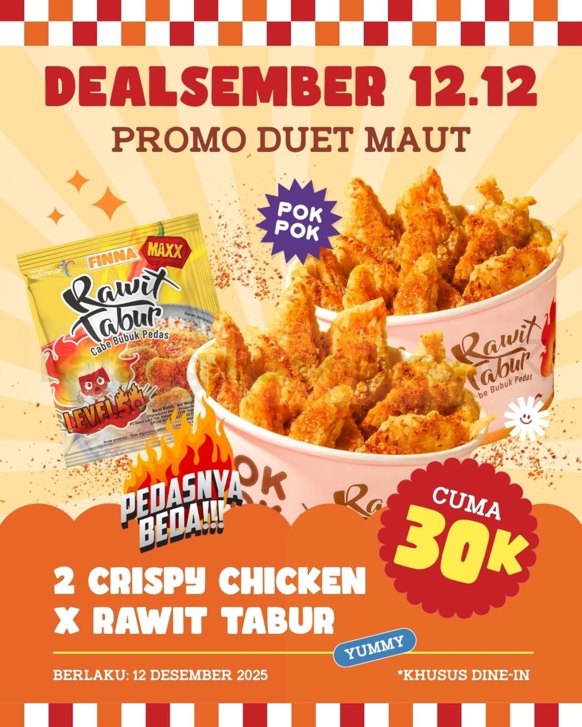 Promo PokPok DEALSEMBER 12.12 2 Crispy Chicken Rp. 30.000, nikmati duet maut kress + Rawit Tabur Level 50, berlaku 12 Desember di outlet tertentu.