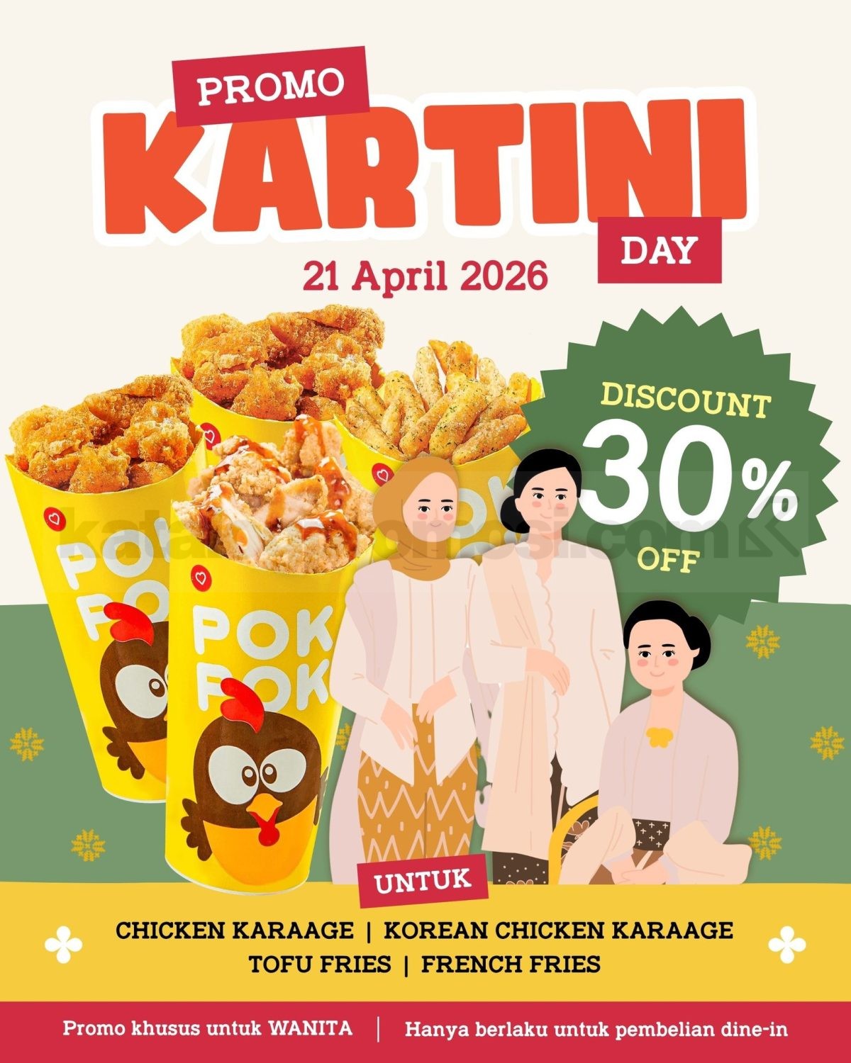 Diskon 30% berlaku untuk beberapa menu snack pilihan PokPok yang bisa didapat saat pembelian langsung di outlet pada tanggal 21 April 2026 khusus pelanggan wanita dalam rangka promo Hari Kartini.