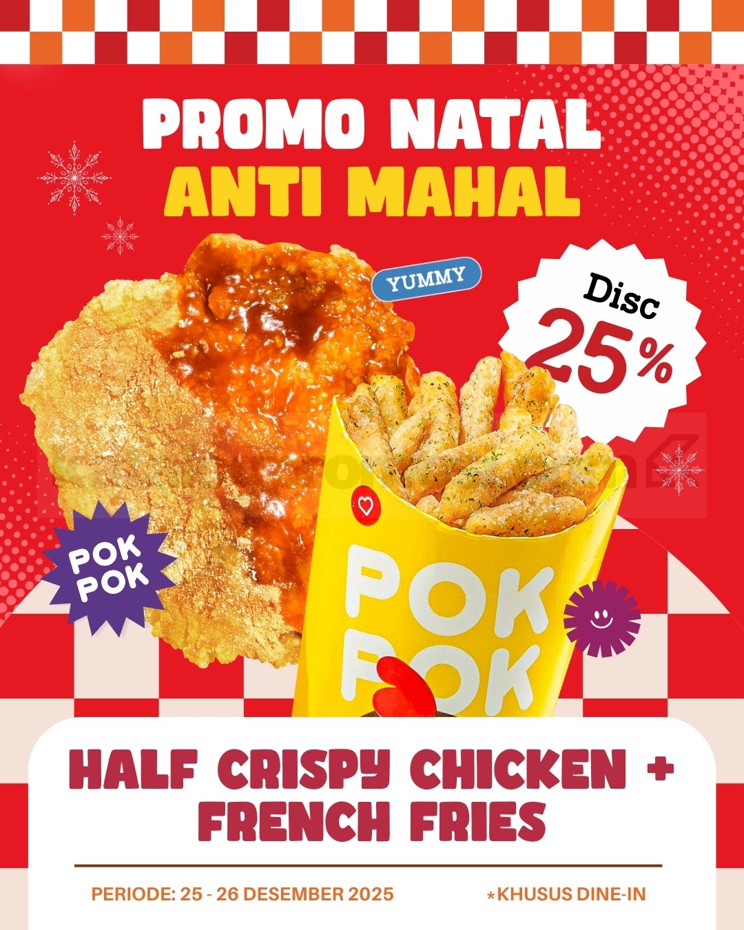 Promo PokPok Natalan Half Crispy Chicken Diskon 25% paket ayam crispy + kentang untuk dine-in, berlaku mulai tanggal 25 Desember 2025 – 26 Desember 2025 di lokasi tertentu.