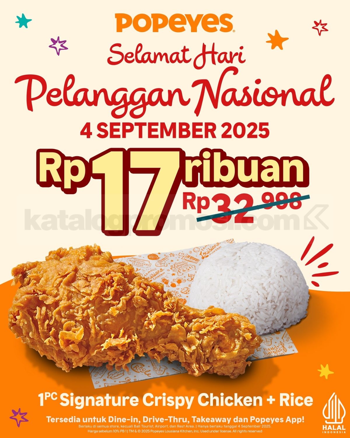 Promo Popeyes Harpelnas 1pc Crispy Chicken + Rice Rp17 ribuan berlaku 4 September 2025 untuk dine-in, drive-thru, takeaway, dan Popeyes App di outlet tertentu.