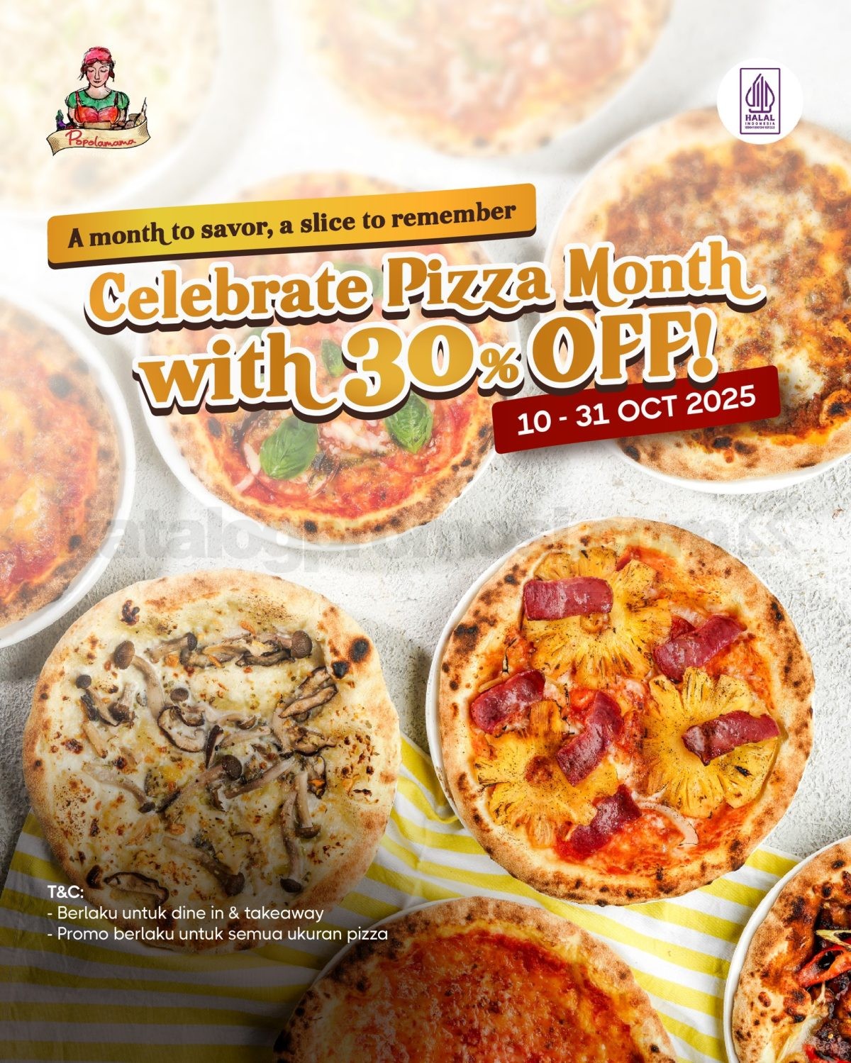 Promo POPOLAMAMA Pizza Month diskon 30% untuk semua ukuran pizza berlaku 10–31 Oktober 2025, bisa dine-in & takeaway di seluruh outlet Popolamama.