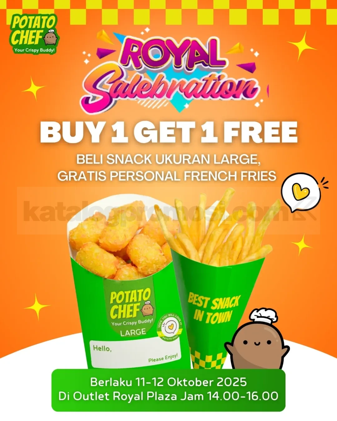 Promo Potato Chef Royal Salebration! Beli 1 snack Large gratis Personal French Fries. Berlaku 11-12 Oktober 2025 di Royal Plaza Surabaya.