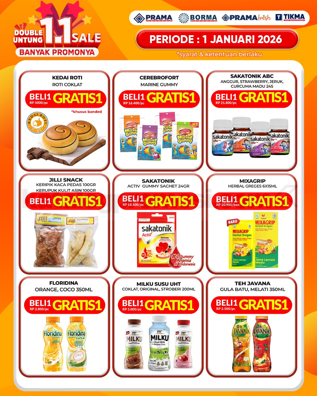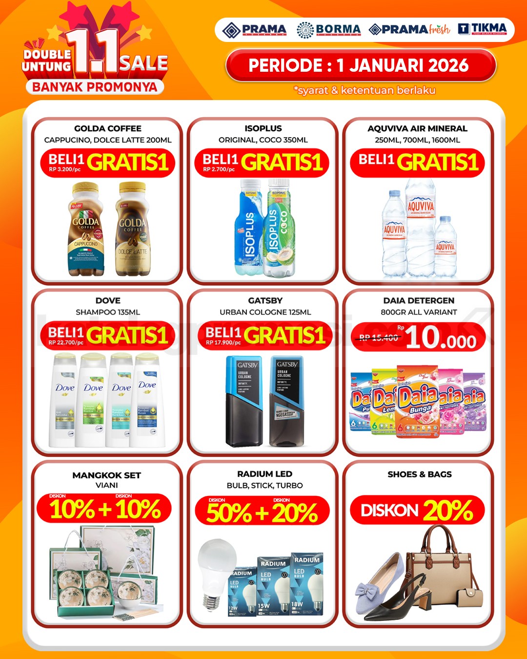 Di tanggal 1.1 atau 01 Januari 2026, Prama Borma menghadirkan promo spesial yang berlaku hanya satu hari. Cocok buat isi ulang kebutuhan rumah, belanja segar, atau sekadar mampir belanja karena momennya memang jarang datang dua kali.