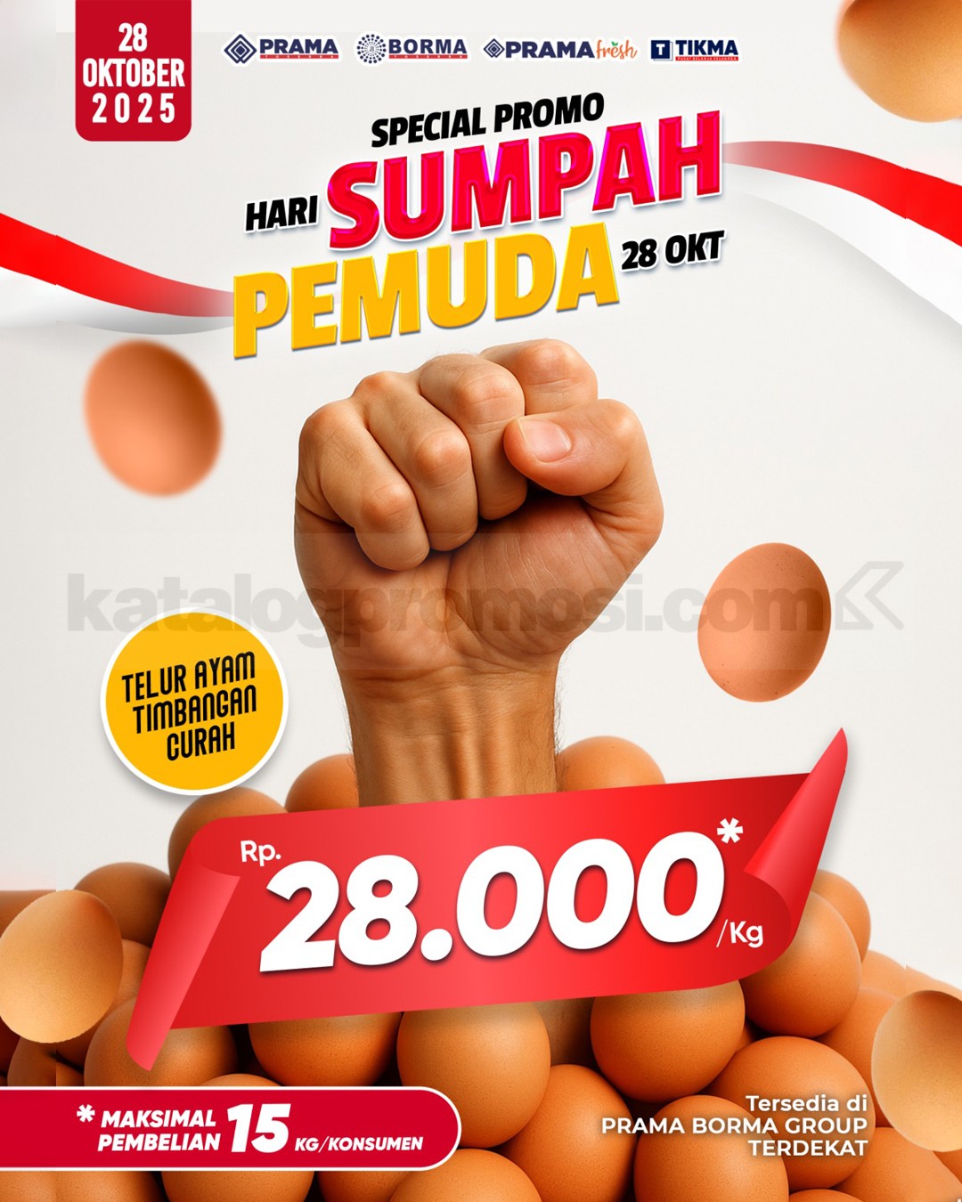 Promo PRAMA BORMA Sumpah Pemuda 28 Oktober 2025 harga spesial telur curah Rp. 28.000/kg. Berlaku 1 hari di outlet PRAMA, BORMA, PRAMA FRESH, dan TIKMA.