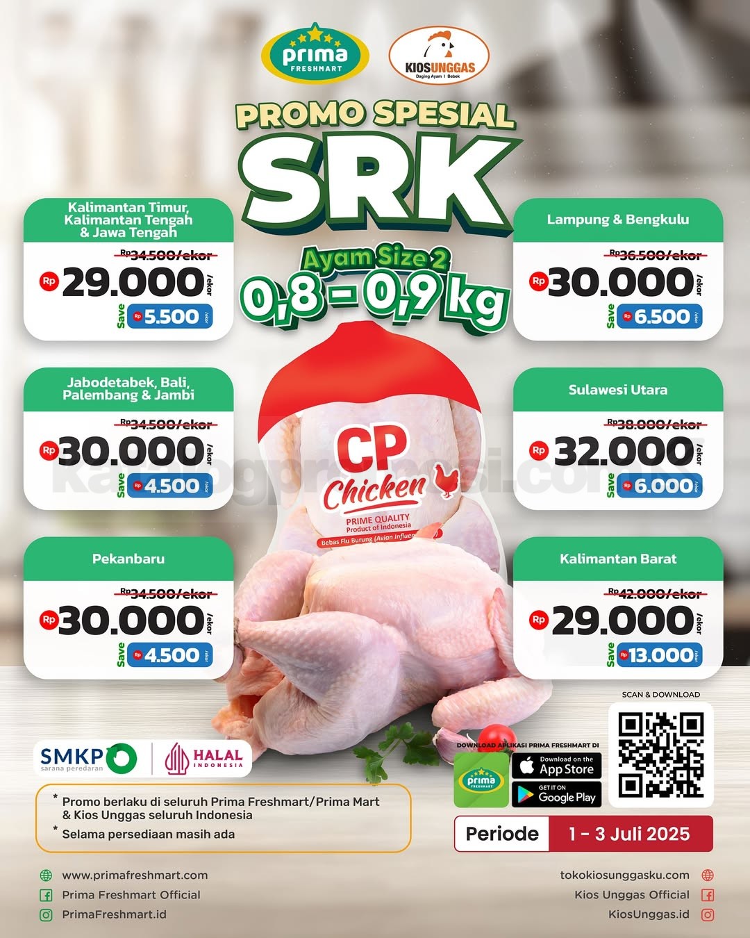 Promo SRK Ayam CP Chicken ini cuma berlangsung 3 hari, kamu bisa dapetin ayam segar berkualitas dengan harga spesial di seluruh Prima Freshmart, Prima Mart, dan Kios Unggas se-Indonesia.