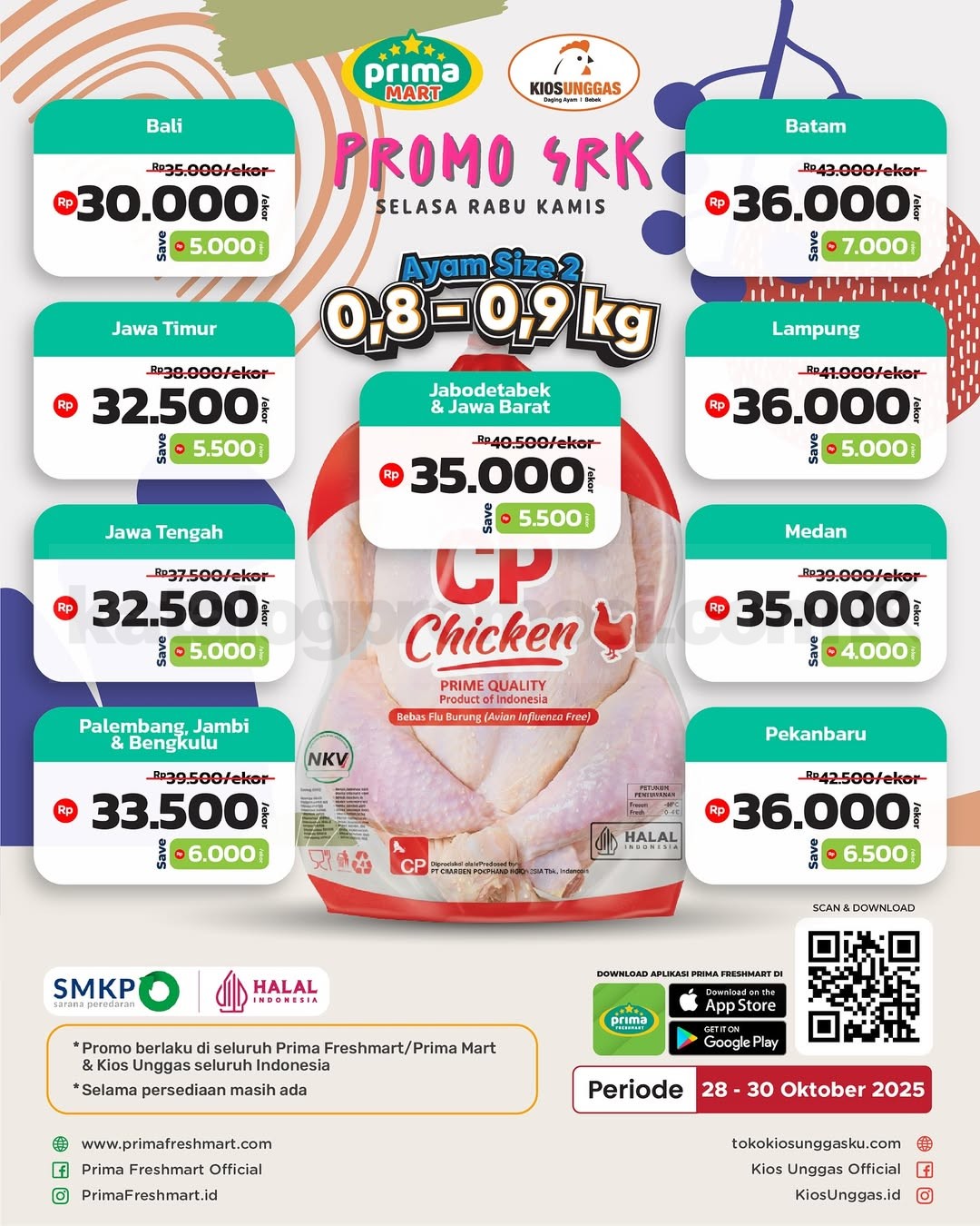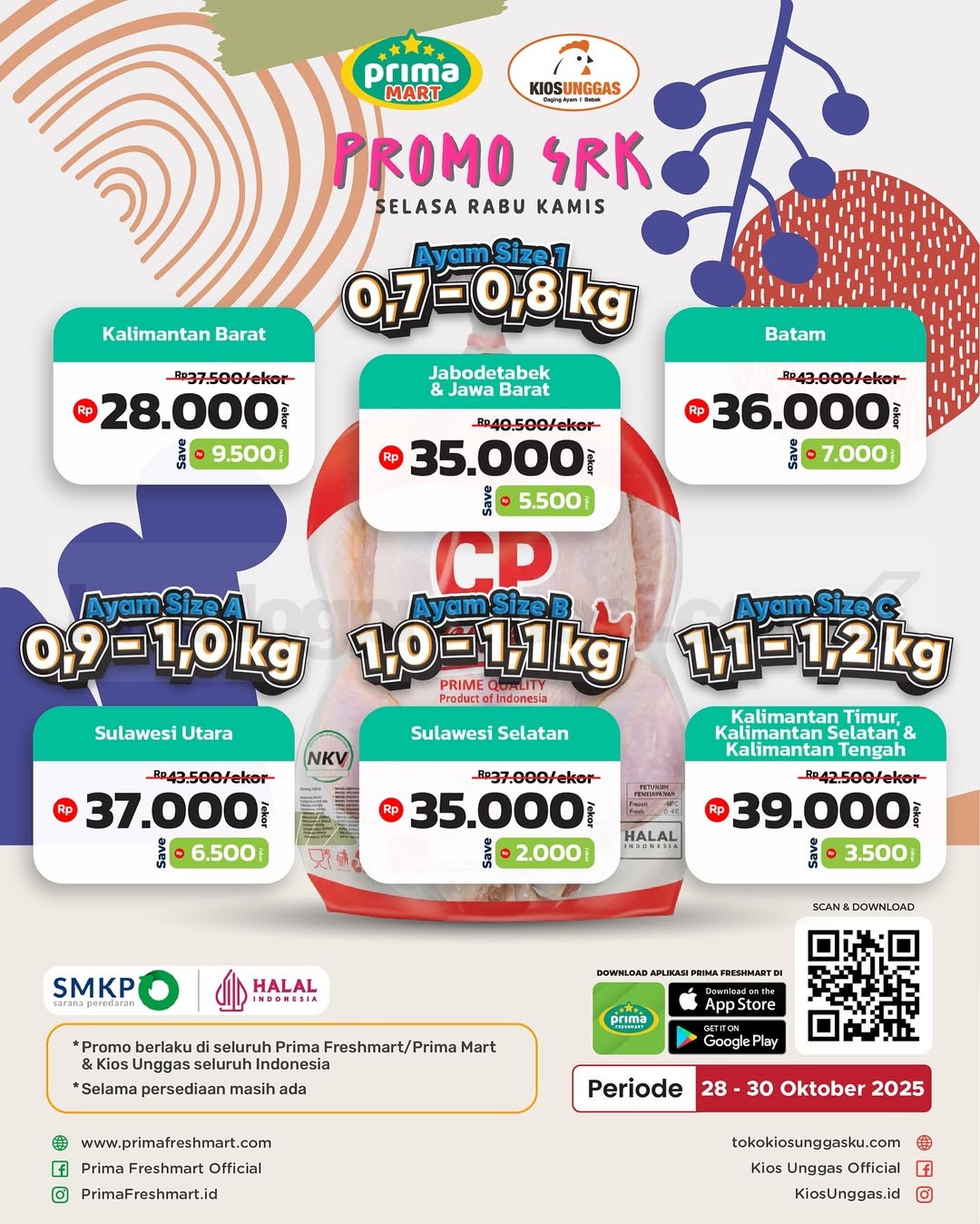 Promo Prima Freshmart SRK Ayam CP Chicken untuk periode 28-30 Oktober 2025! Buruan borong ayam segar bebas flu burung di seluruh Prima Freshmart, Prima Mart & Kios Unggas se-Indonesia