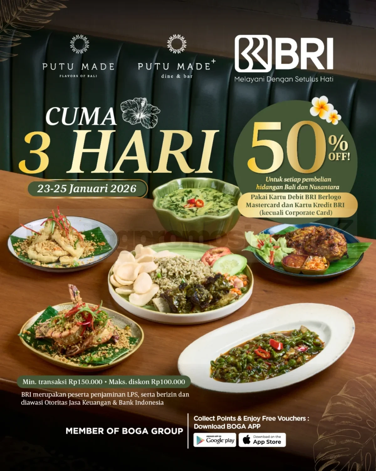 Promo PUTU MADE BRI diskon 50% Semua Menu hidangan Bali & Nusantara berlaku 23 β 25 Januari 2026 dengan pembayaran kartu BRI di outlet tertentu.