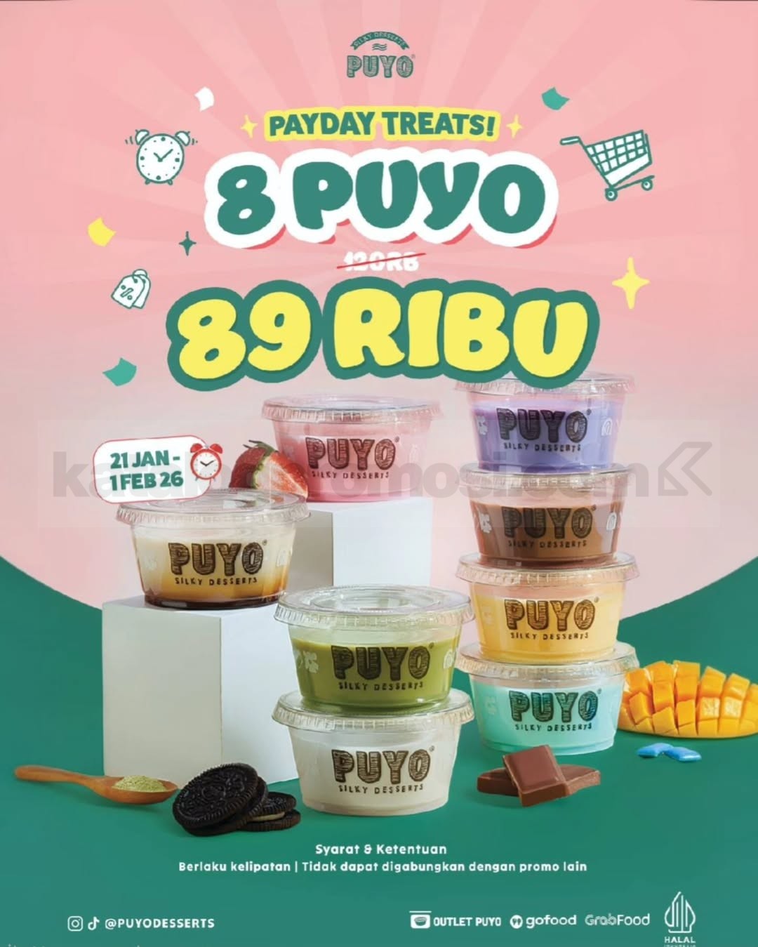 Promo Puyo Payday Treats Silky Desserts 8pcs Rp. 89.000 untuk momen payday manis, beli paket dessert favorit dengan sistem kelipatan, berlaku mulai tanggal 21 Januari 2026 – 01 Februari 2026.