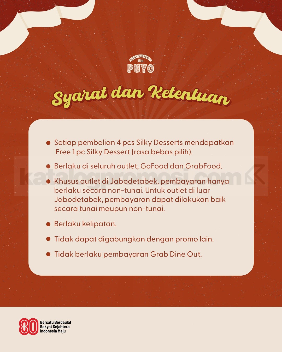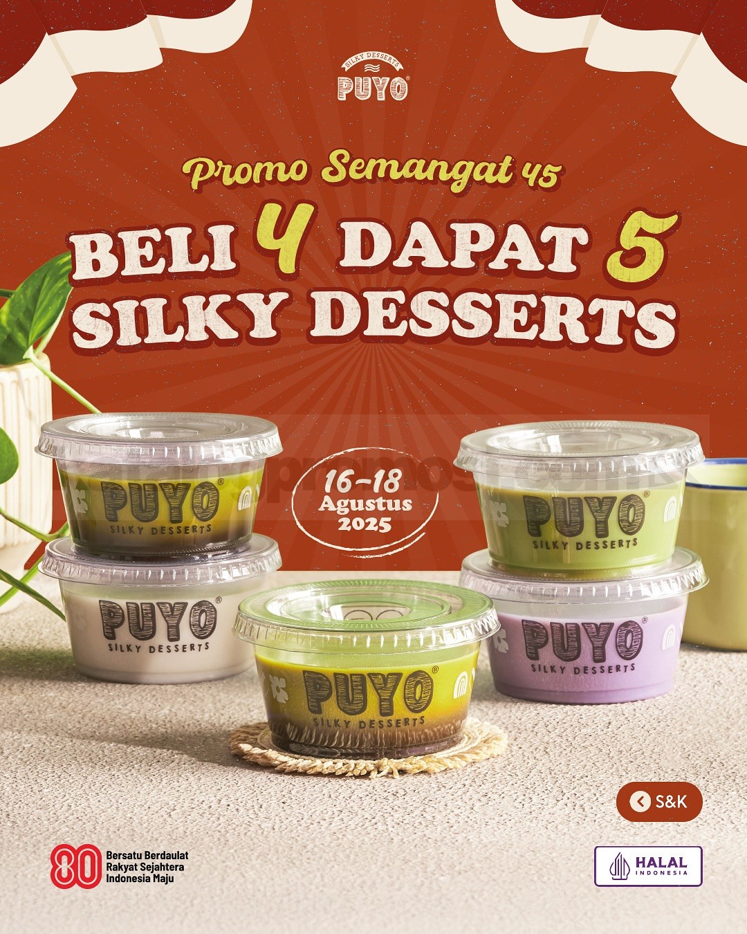 Promo Puyo Semangat 45 hadir buat nemenin momen manis di bulan Agustus! Cuma 3 hari, 16–18 Agustus 2025, beli 4 Silky Desserts langsung dapat gratis 1. Rasanya bebas pilih, hematnya bikin semangat makin berkobar! 🔥