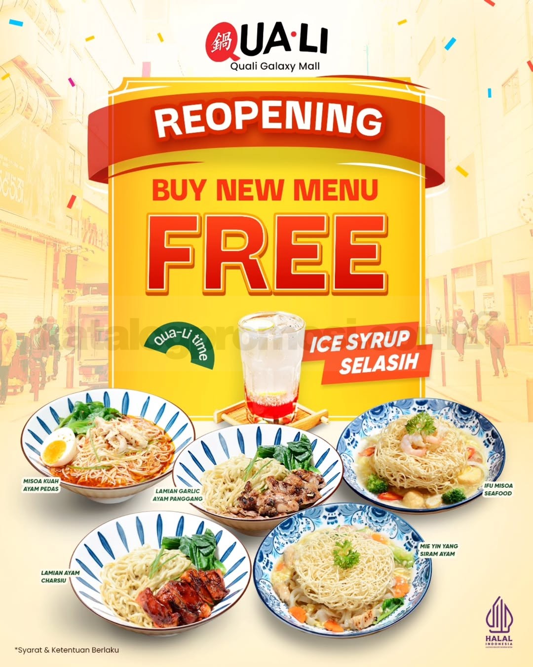 Ayo datang ke Quali Galaxy Mall, coba menu baru favoritmu, dan nikmati Promo Quali Galaxy Mall Reopening Gratis Ice Syrup Selasih untuk pengalaman kuliner yang segar dan menyenangkan! ๐ฅคโจ